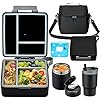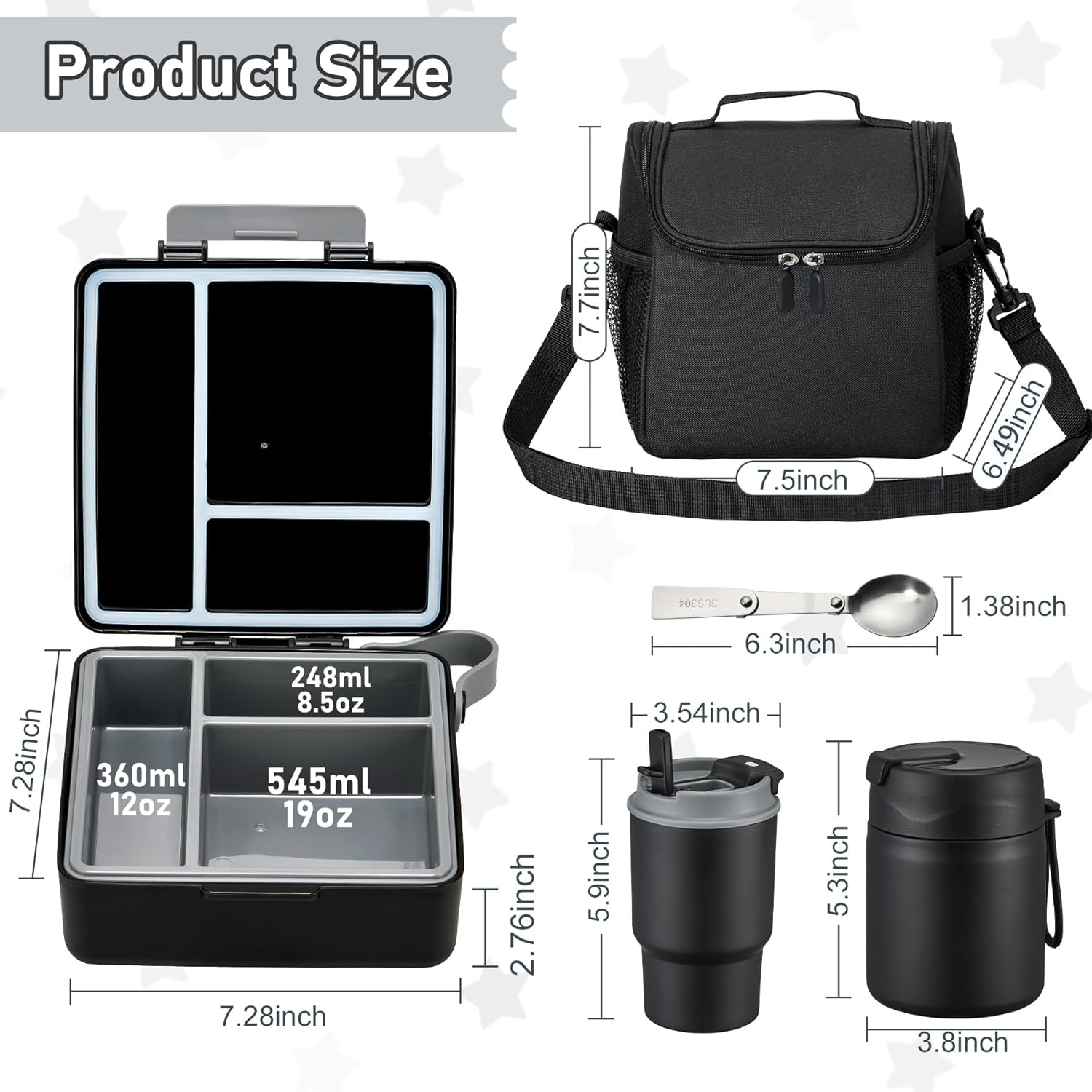 Bento Lunch Box for Kids with 17oz Soup Thermo,Insulated Tumbler Water Bottle and Insulated Lunch Bag,Leak-Proof 3 Compartment Lunch Food Container with with Ice Pack for Kids to School-Black