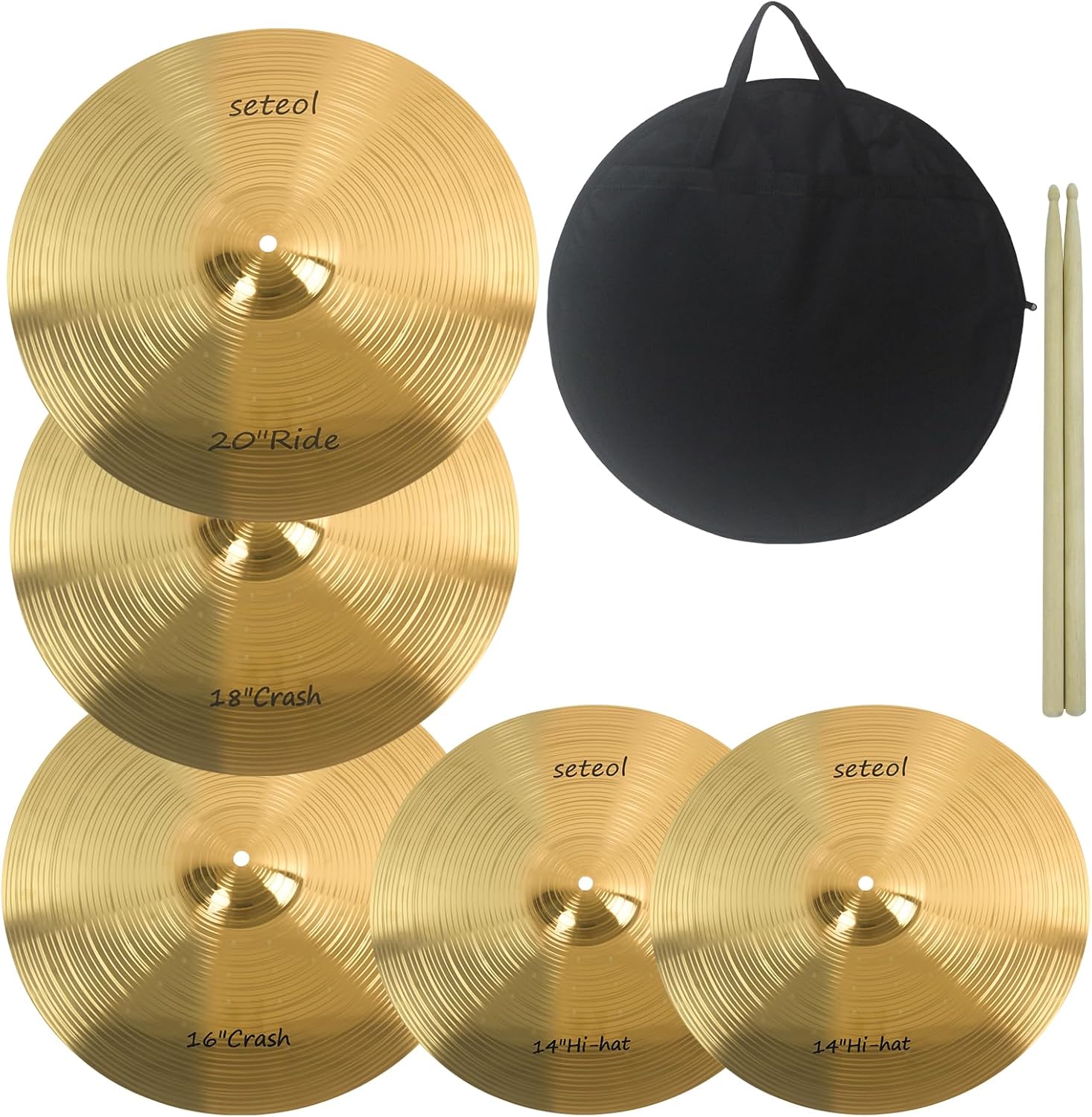 Seteol Low Volume Cymbal Pack Drum Set, 2 x 14" Hi-hat Cymbal + 16" Crash + 18" Crash + 20" Ride Cymbals + Bag + 2 x Drum Stick, Golden Mute Quiet Drum Cymbals Kit