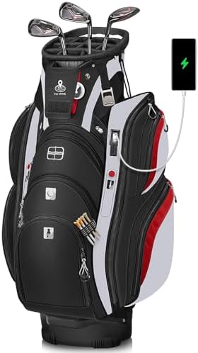 Many Pockets for Golf Accessories: Picture having your golf balls, range finder, tees, gloves, shoes, towel, water, phone, key, pen and umbrella, powerbank, each in its own pockets, organized and ready for use. The intelligently designed pockets provide quick access to everything you need, reducing the stress of searching for golf cart accessories. With everything neatly stored and within easy reach, this cart golf bag with usb charging port is a great golf gift for men