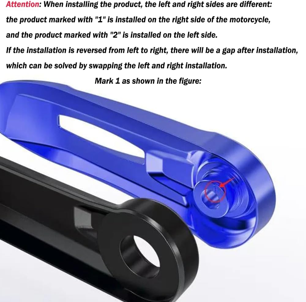◀Installation guide: When installing the product, the left and right sides are different: the product marked with "1" on the back of the product is installed on the right side of the motorcycle, while the other product marked with "2" is installed on the left side. If the installation is reversed from left to right, there will be gaps after installation, which can be solved by swapping the left and right installations.