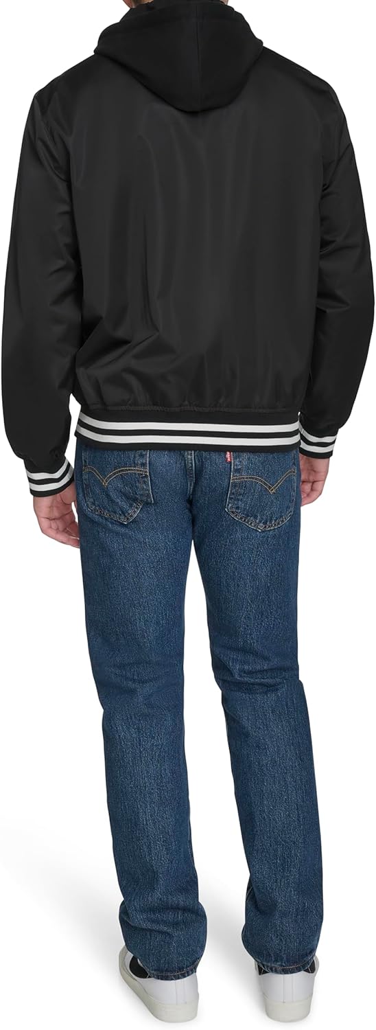 Convenient Welt Pockets: Two lower welt pockets for secure storage and easy access to essentials. Snap-Zipper Closure: Center front snap zipper placket for a stylish and functional closure with an adjustable fit. Lightweight Fabric: Soft and breathable material for comfort and flexibility, perfect for layering. Classic Rib Knit Detailing: Stripe rib knit at the hem and cuff for a traditional varsity look with added stretch. Adjustable Hood: Drawstring at the hood allows for a customizable fit and extra warmth when needed.