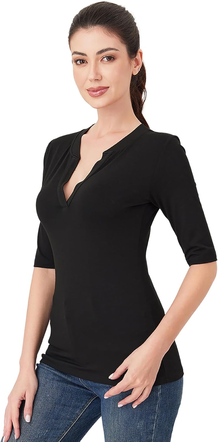 AmélieBoutik Women Deep V Neck Half Sleeve Knit Slim Fitted Tops Casual Work Solid Shirt Blouse