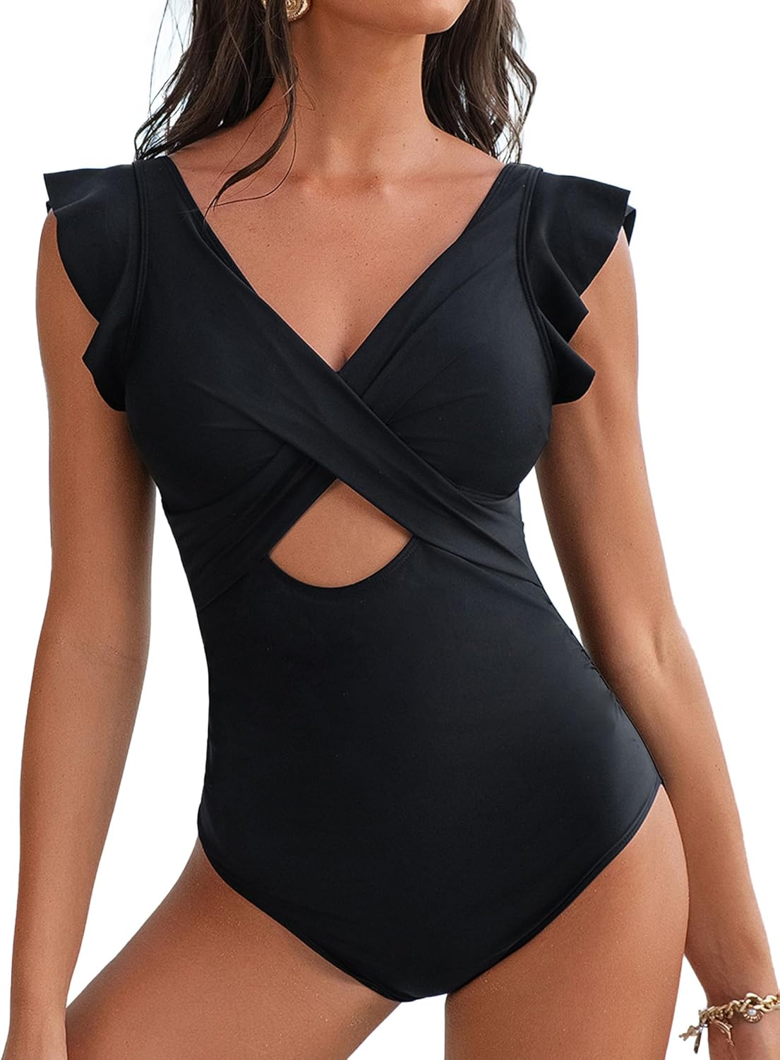 Buauty Womens One Piece Ruffle Sleeve Cutout Swimsuits Tummy Control Bathing Suits for Women 2025
