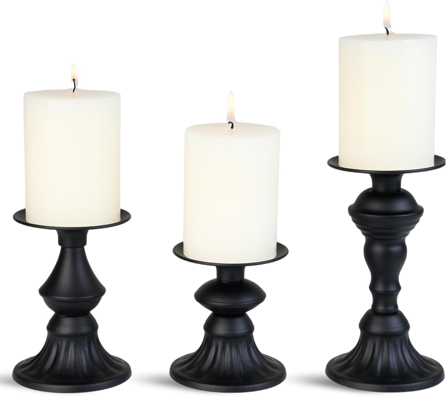- Elevate your home décor with this stunning set of 3 black metal pillar candle holders. Designed to blend rustic charm with timeless elegance, these candle stands make the perfect addition to any space, whether styled on a dining table, mantle, or as a centerpiece for special occasions.- Crafted from durable, high-quality metal, these holders provide a sturdy base for your favorite pillar candles. The sleek black finish and varying heights create a visually dynamic display, ideal for rustic centerpieces, farmhouse mantel decor, or wedding table arrangements.- More than just candle holders, this set brings warmth and sophistication to any setting. Whether you're decorating for the holidays, hosting a dinner party, or simply enhancing your everyday home décor, these elegant candle holders will add charm and ambiance to any occasion.- Transform your space with these timeless pillar candle holders—a must-have for those who appreciate stylish and functional home accents.