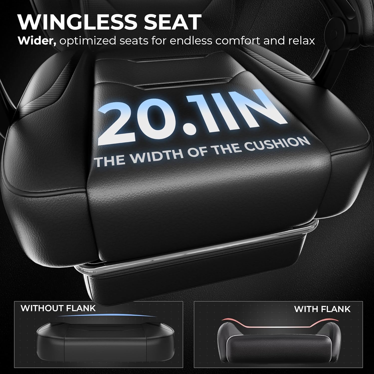 HEAVY DUTY GAMING CHAIR -- Specially designed for the big and tall person, enlarged backrest and wingless seat (seat size: 20.1W" X 19.7D"), supports up to 350 pounds. Revel in the freedom to stretch out, cross your legs, or simply recline in spacious comfort.