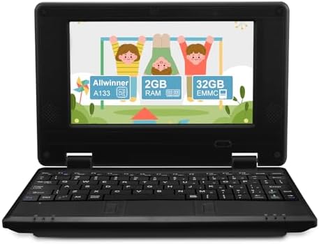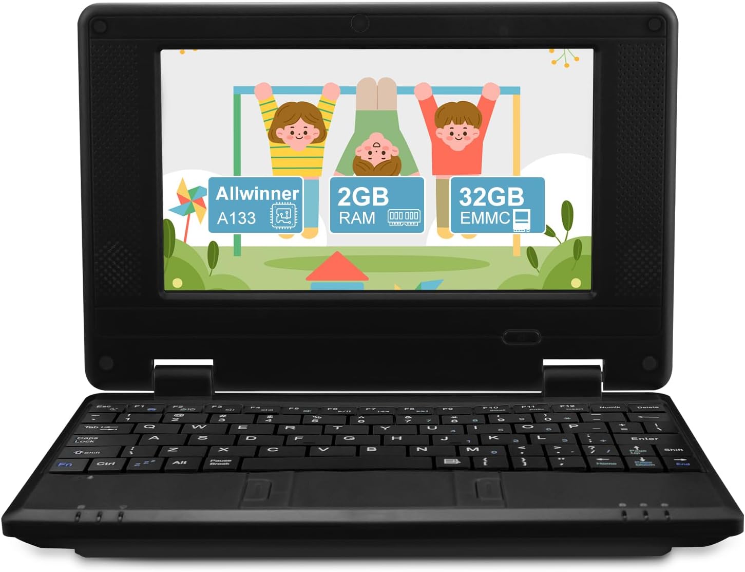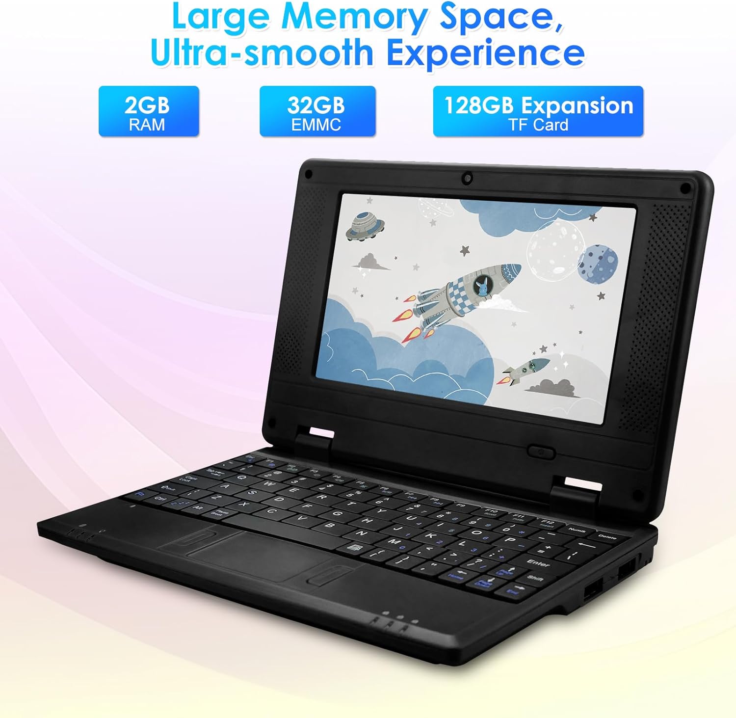 7" Portable Small Laptop, Android 12.0 OS Quad-Core Cortex A53 with 2GB RAM 32GB ROM,Processor A133P Type-C 5V 2A Mini Laptop Notebook for Kids (Black)