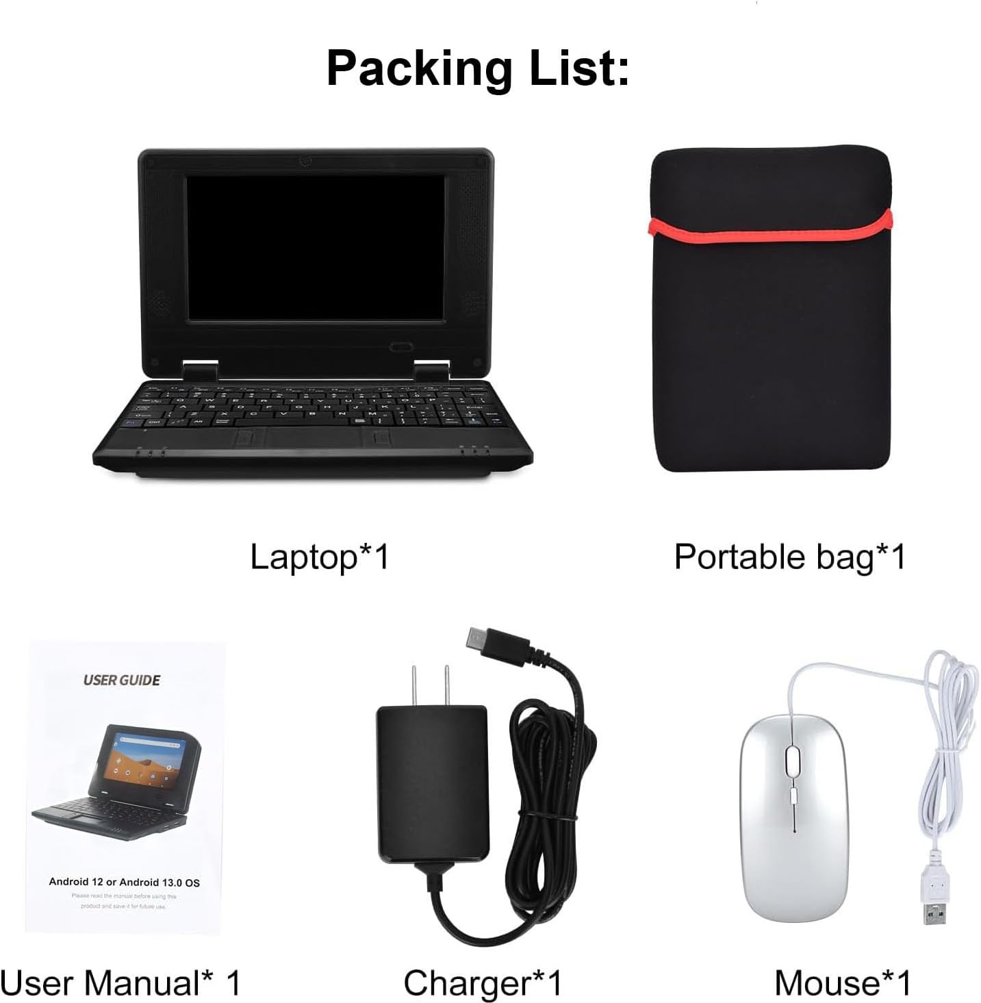 LCD Display:7 inch HD screen 1024*600 CPU: Allwinner A133 Quad-core @1.5Ghz OS:Android 12 RAM:2GB Storage: On board EMMC 32GB Housing Material: ABS+PC Camera: Front 0.3MP WIFI: Built-in WIFI support 802.11b/g/n Bluetooth: Built-in Bluetooth V4.0 Input/Output Port: 1*Type-C(for charging) 2*USB 2.0 1*SD card port Speaker: 2 speakers Battery: Built-in 3.8V 3600mAh Polymer battery MIC: Built-in Microphone Charging Adapter: Input:100-240V; Output: 5V2A PACKAGE LIST: 1 x 7 inch Android laotop 1x Laptop Protect case 1 x Charger 1 x Mouse 1 x User Manual