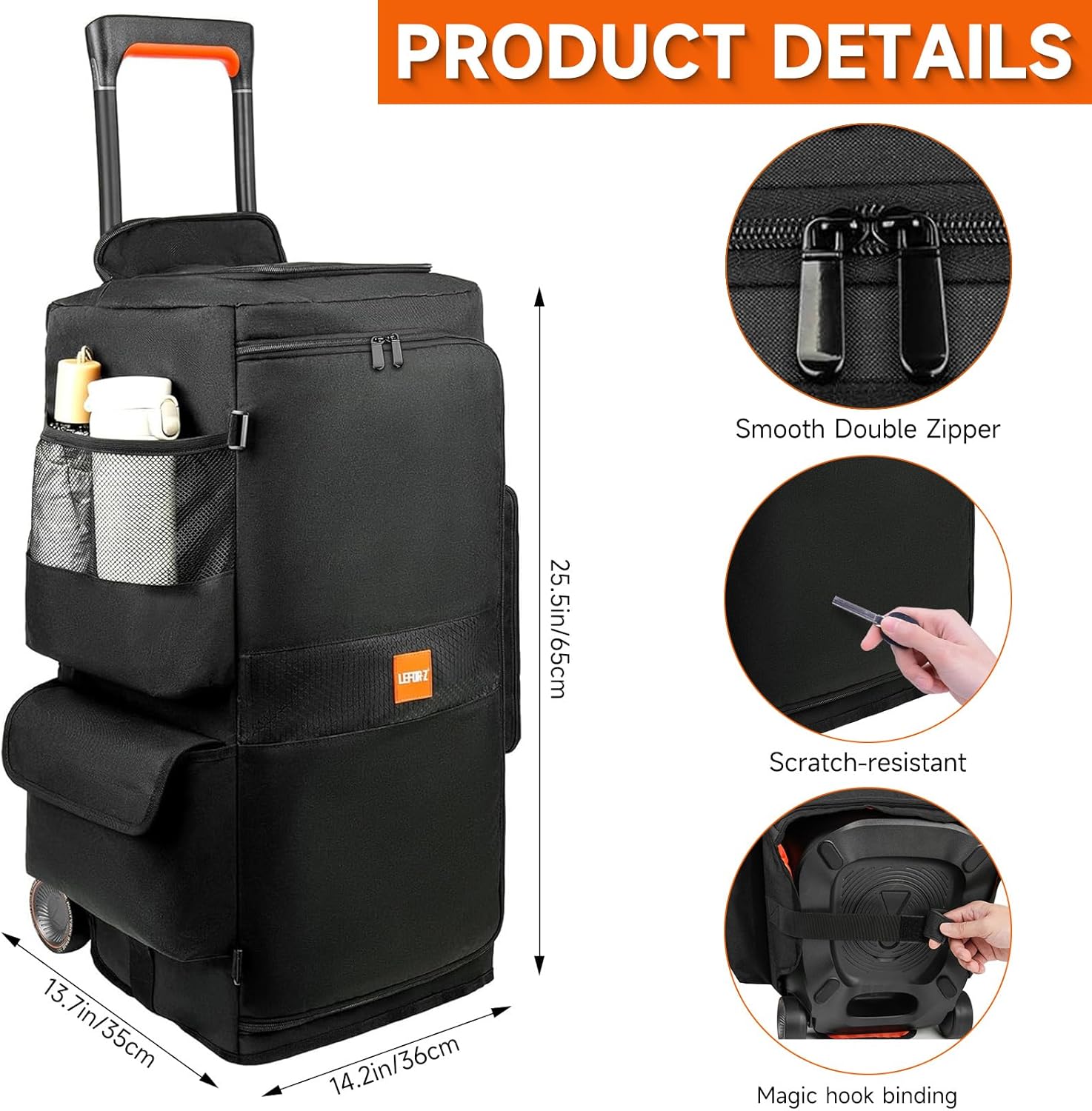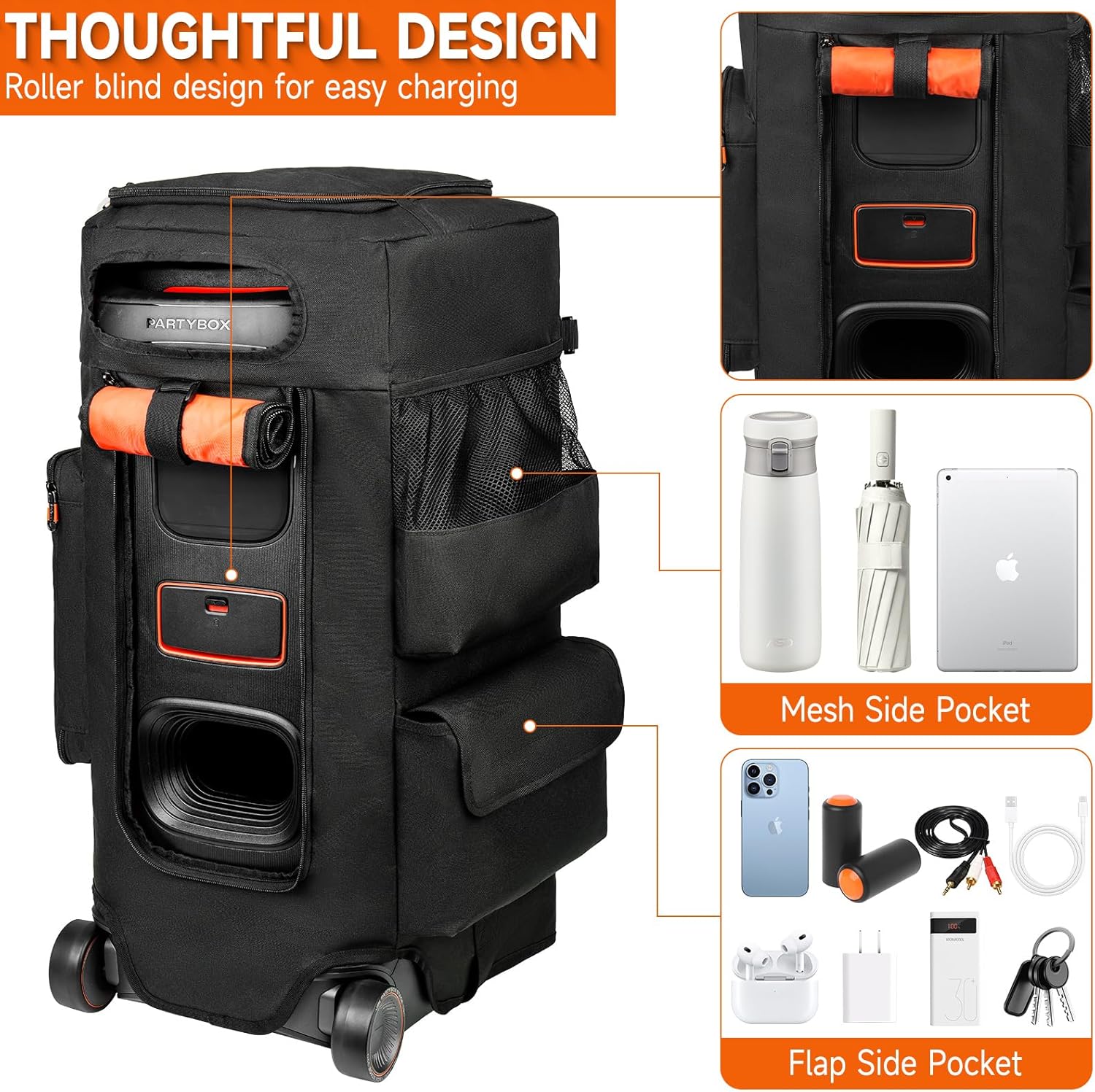Multifunctional Pockets: This speaker case has multiple storage pockets in different forms, which can easily store umbrellas, water bottles, tablets, 3 microphones, cables, chargers, mobile phones and other device accessories, allowing you to carry all accessories with you and keep them neat and organized.