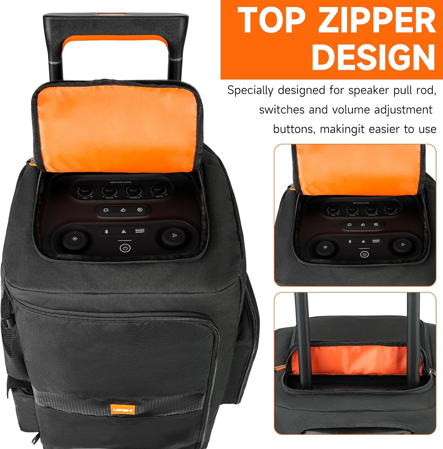 Multi-window Zipper Design: This 320 partybox bag fully considers the needs of users,all ports and buttons are fully accessible. The front and back sides are designed with a roller blind design, which can be rolled up and fixed with Velcro, and the top of the bag is also designed with a separate zipper opening for the top button and pull rod, so that you can use it easily even without removing the protective cover, and support charging and playing music without affecting the sound quality.
