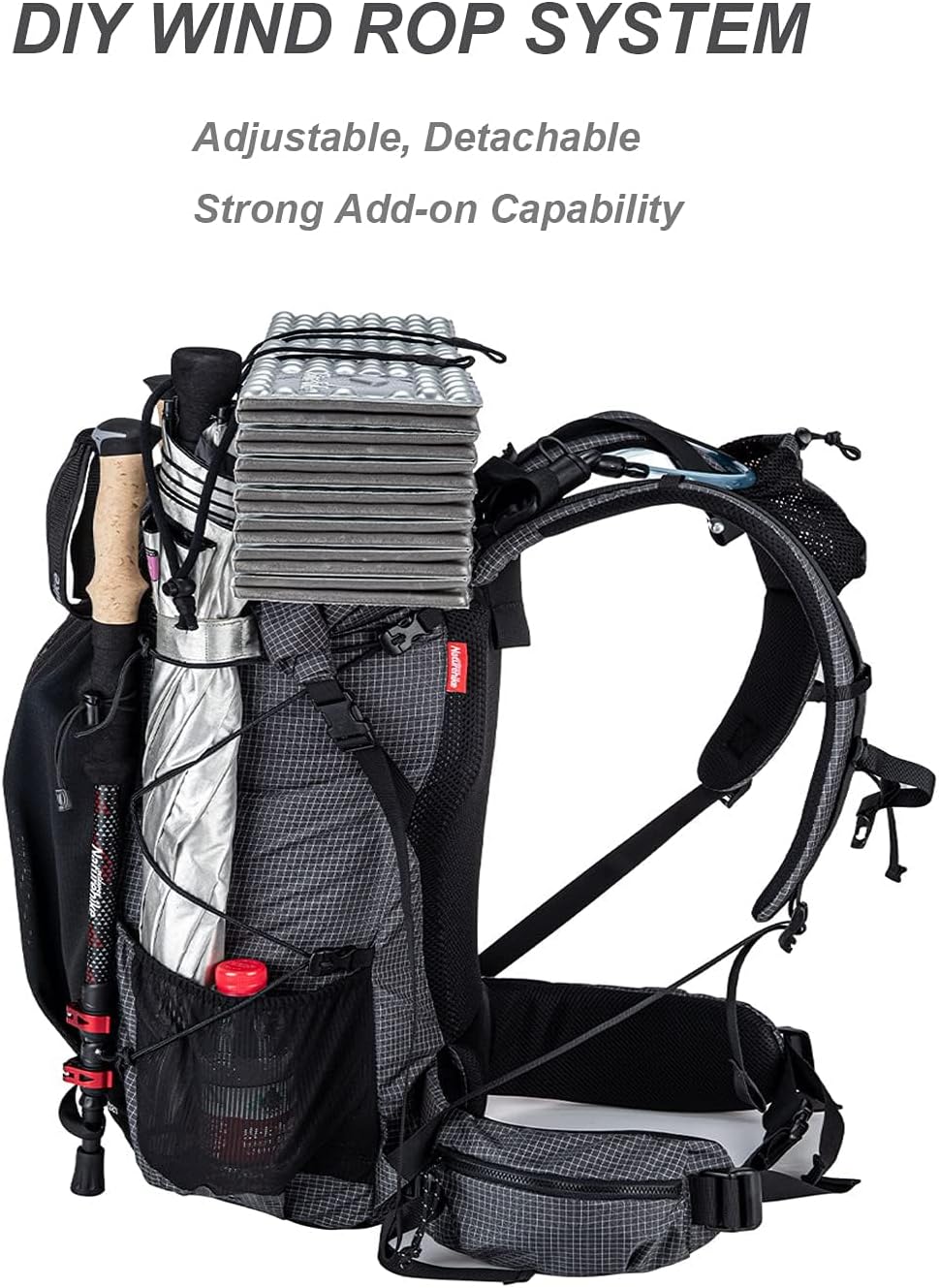 Multi-Pockets and DIY Windrope System:Equipped with multiple pockets, our backpacks provide ample space for storing camping gear. The large open mesh pocket on the backpack's back enables quick access and storage. With compression straps on the top and sides, you can securely bind items like trekking poles or sleeping bags for extra storage.​