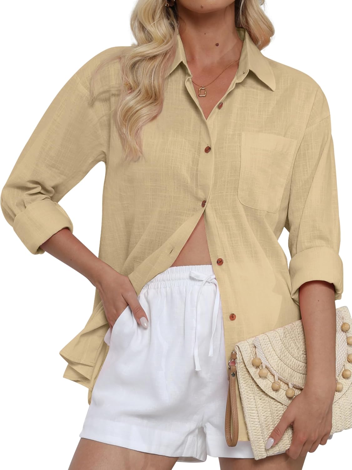 CUNLIN Women's Button Down Shirts Long Sleeve Cotton Summer Beach Wear for Women with Pocket