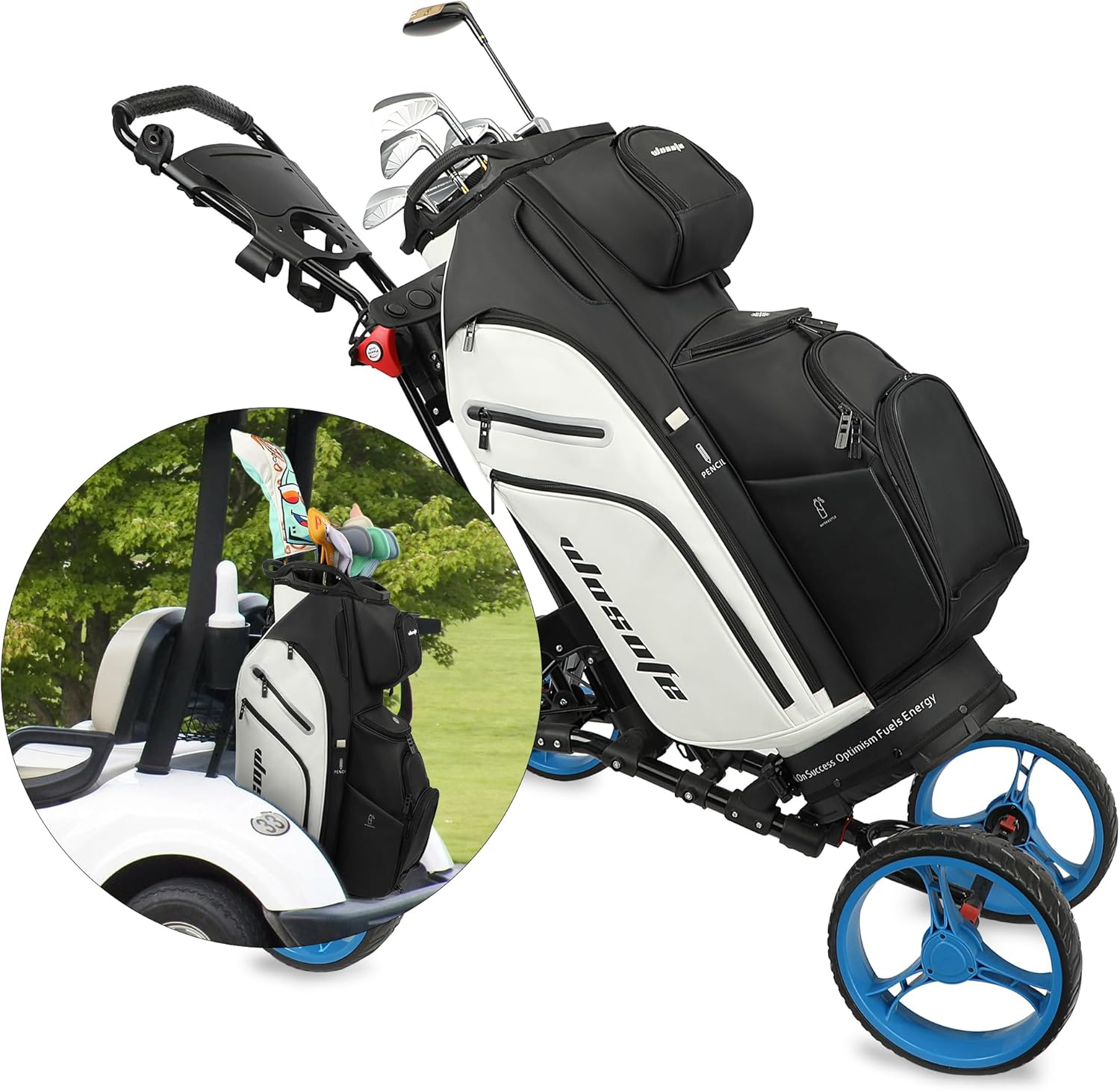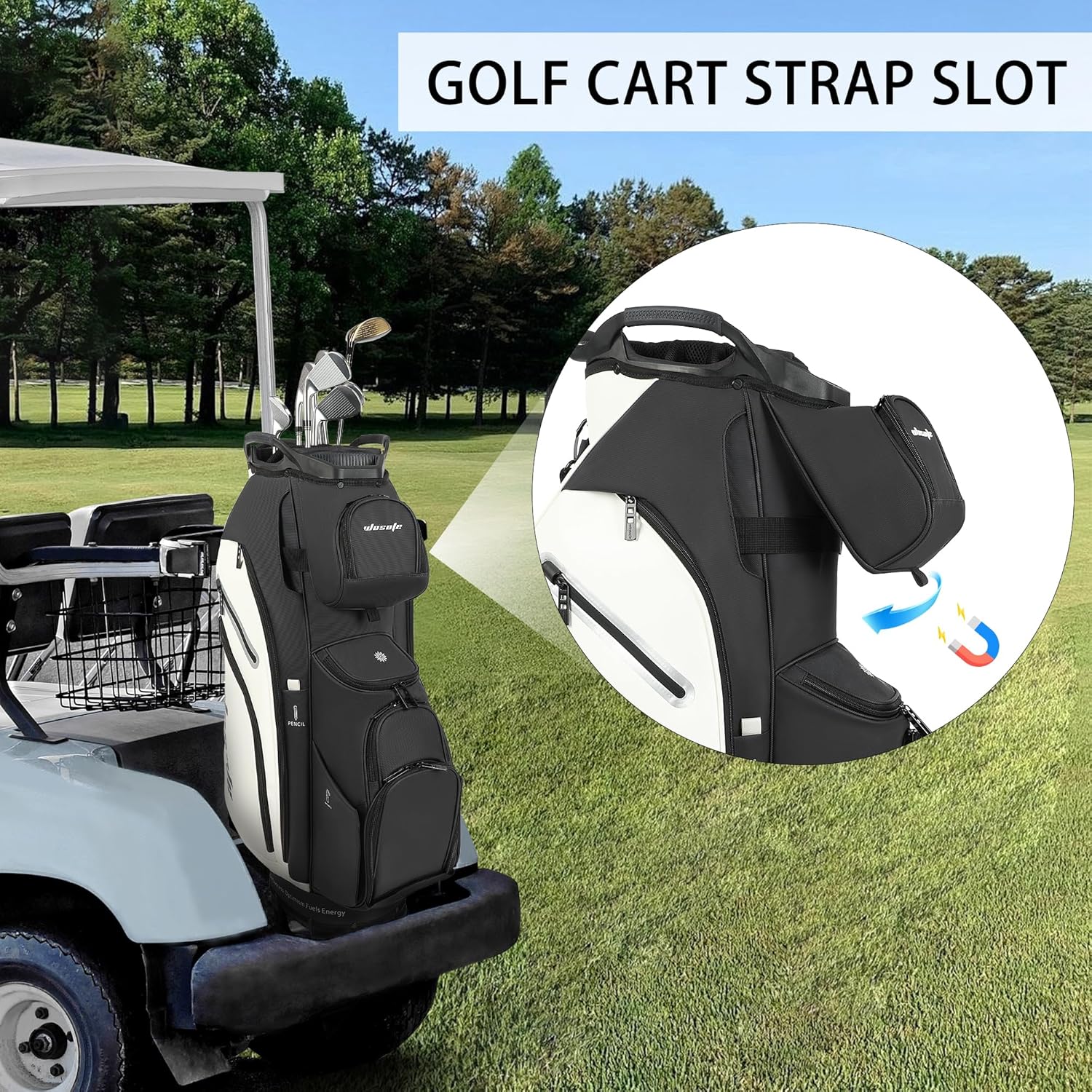 Multifunctional & convenient design: Our golf cart bag is equipped with 10 zipper pockets and cooler compartment to store your equipment and accessories, ensuring sufficient storage capacity, The golf bag comes with a portable rear handle to help you transport the club easily.
