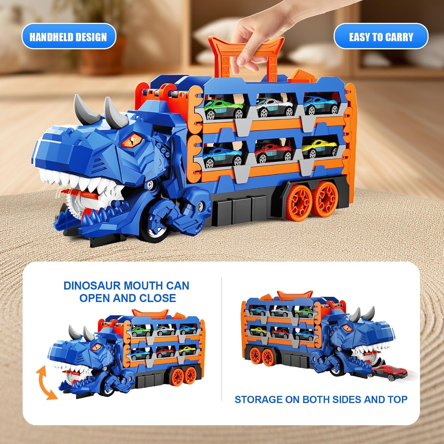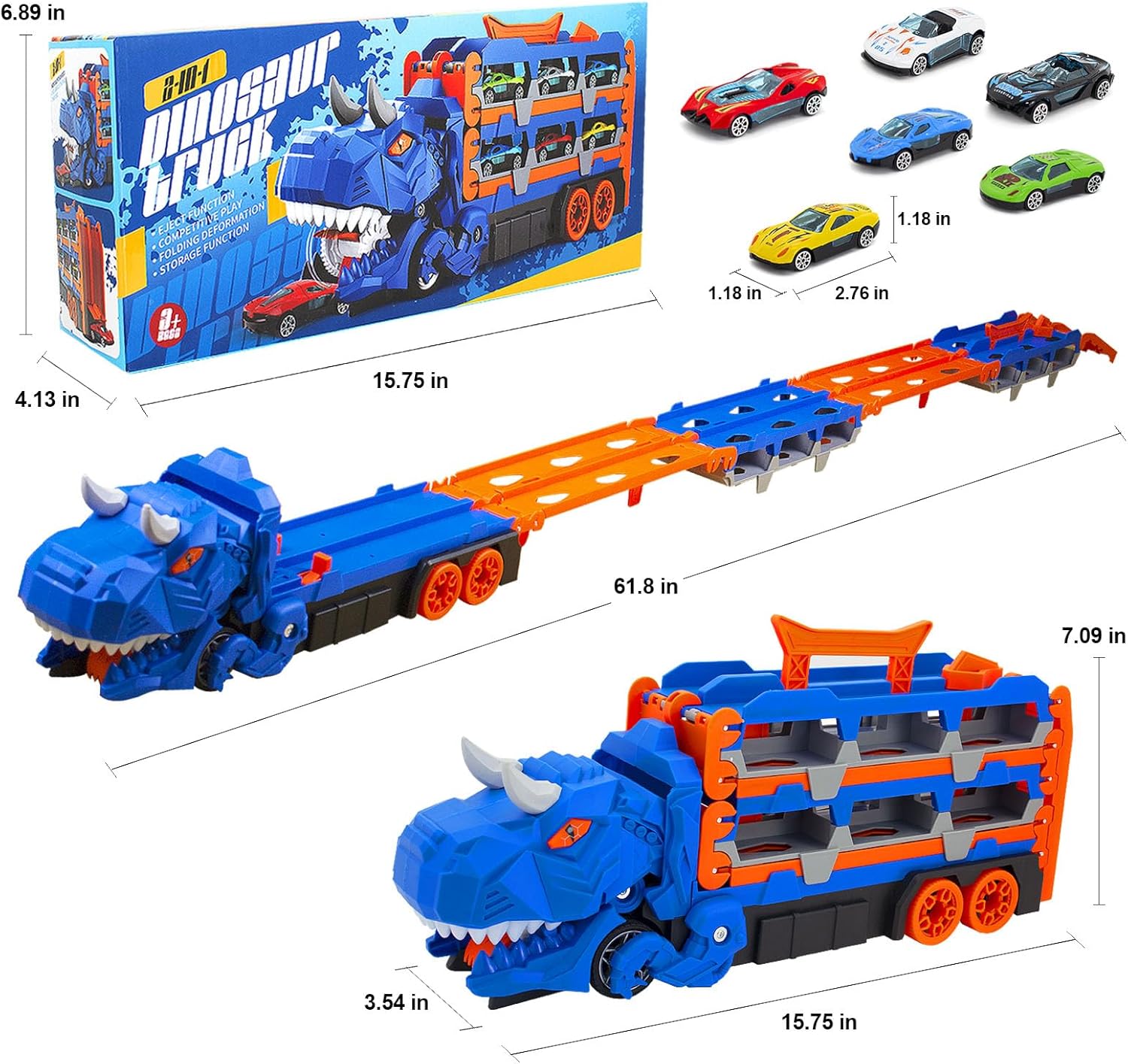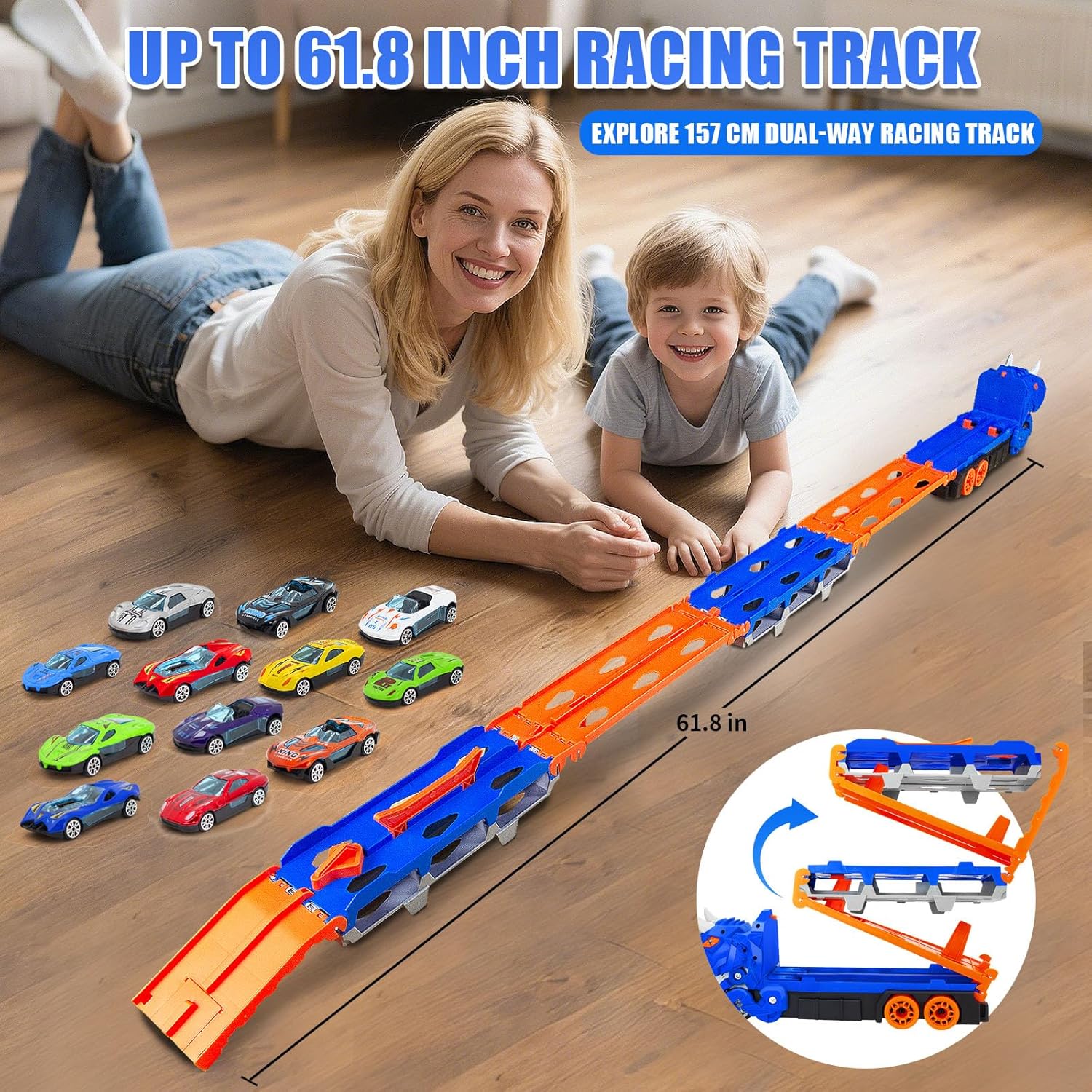 Dinosaur Race Track Toys for Kids 3-12, Transport Truck Toy with 12 Race Cars, Transforming Dino Truck Set with 61.8 inch Dual-Way Foldable Tracks, Toddler Gift Toys for Boys & Girls