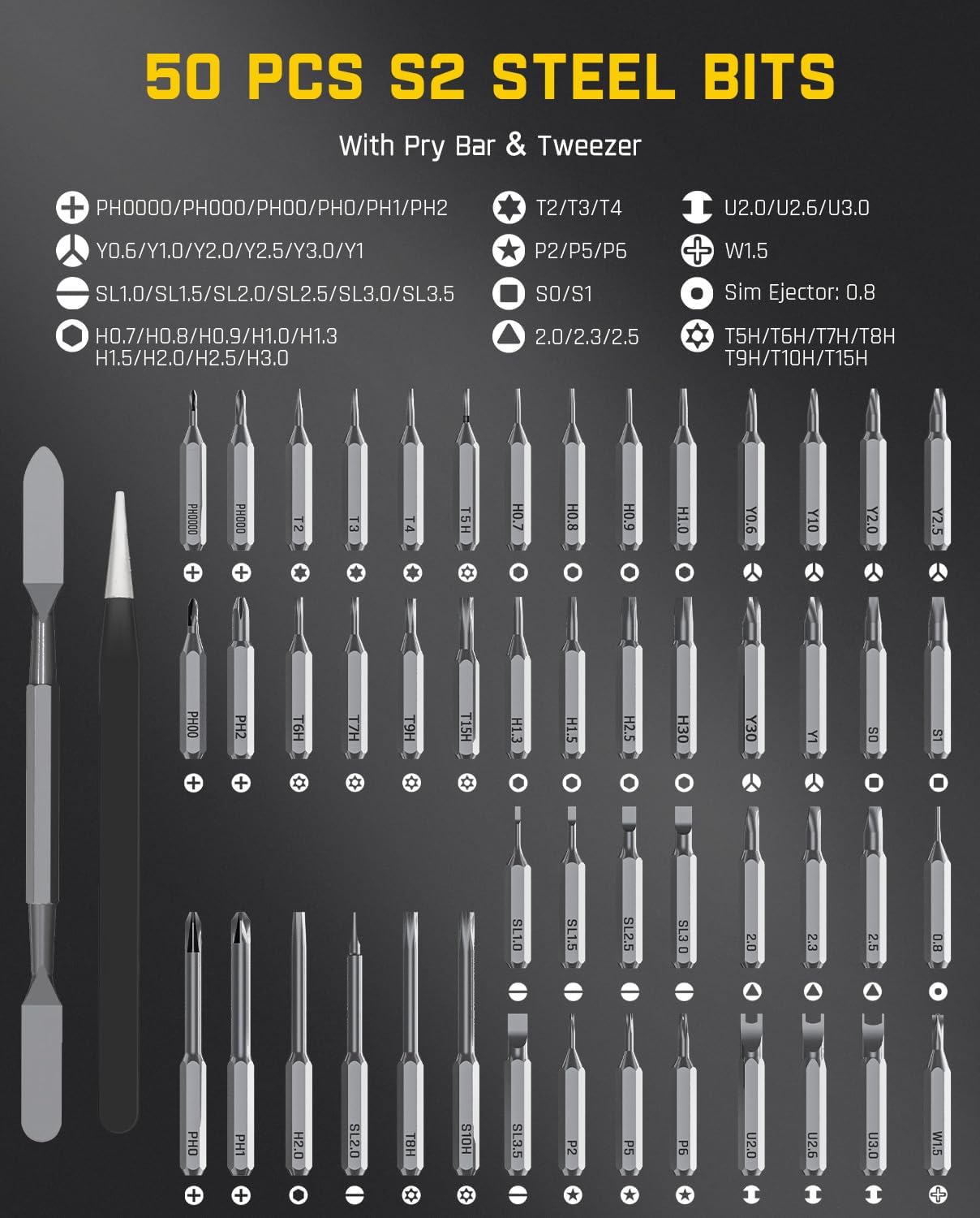 More Bits, More Choices: This electric screwdriver set includes 12 types, a total of 50 high-strength S2 steel precision bits, specially equipped with 1.78-inches long HEX 2.0 bit. It also comes with a pry bar and ESD tweezers for easy repair of small items, which can meet the disassembly needs of various electronic devices.