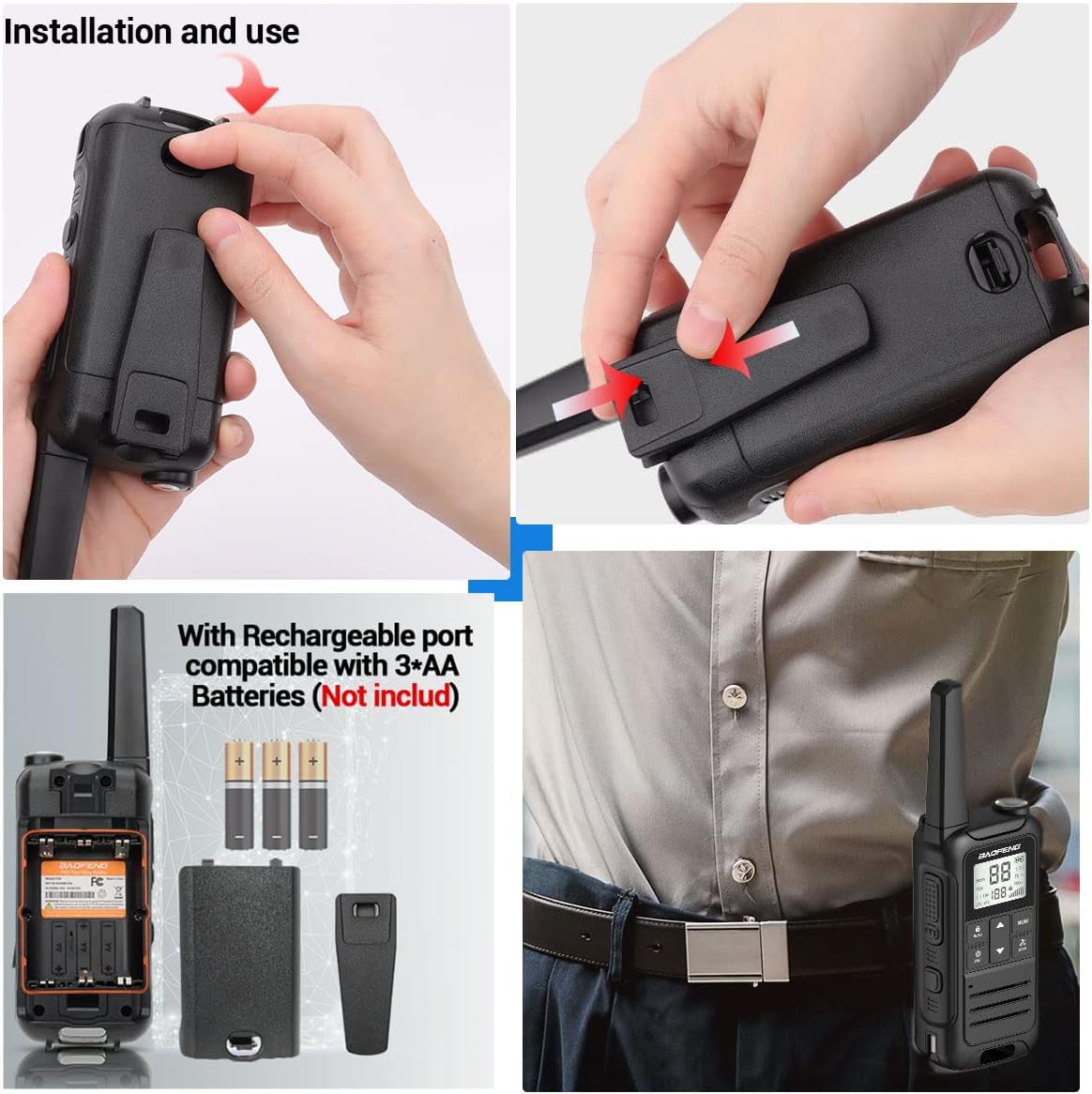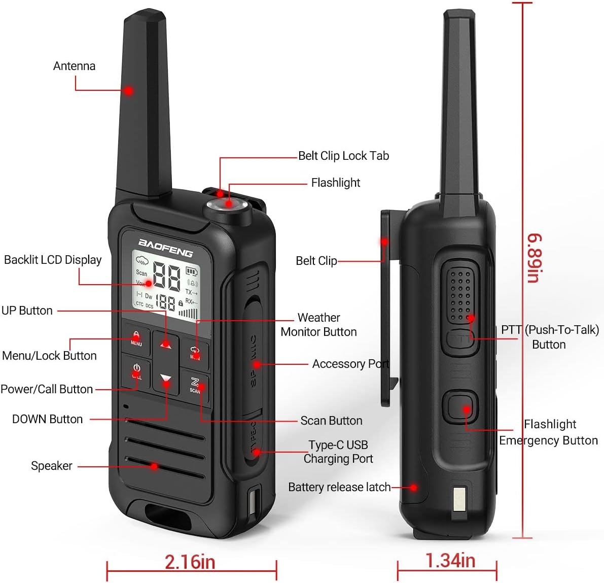 【What you get】Package contains (walkie talkie, belt clip, hand strap,battery ) X 2 and 2 in 1 Type-C charger X1, user manual X1.Easy to operate, suitable for novices, and provide technical guidance. All day customer service replies to ensure your purchase enjoyment.