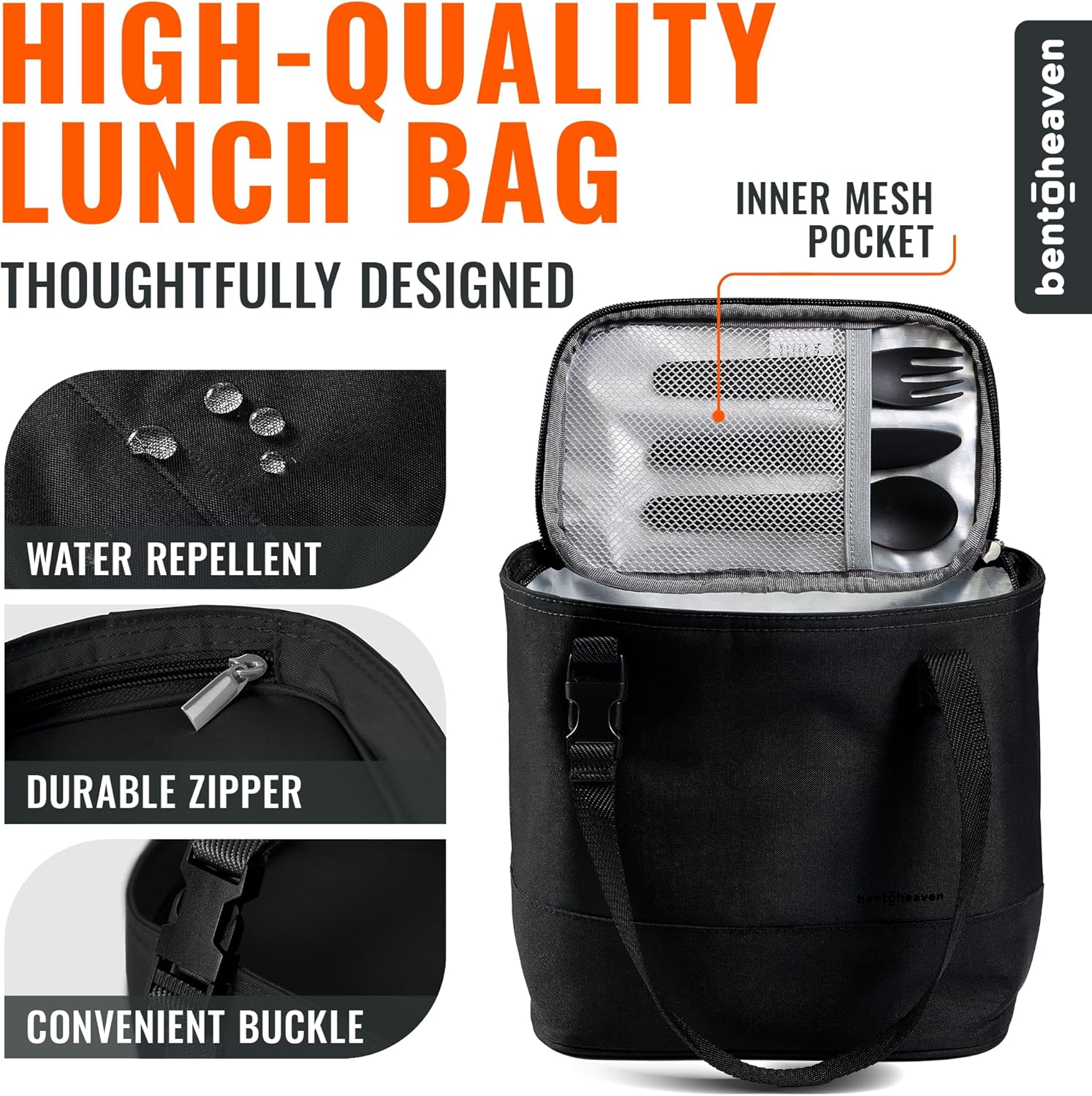 Bentoheaven Insulated Lunch Tote for Work - Durable Materials, Variable Strap/Handle, Wide Opening - Cooler Lunch Bag for Women & Men - Fits all major Bento Lunch Boxes and Other Containers (Black)