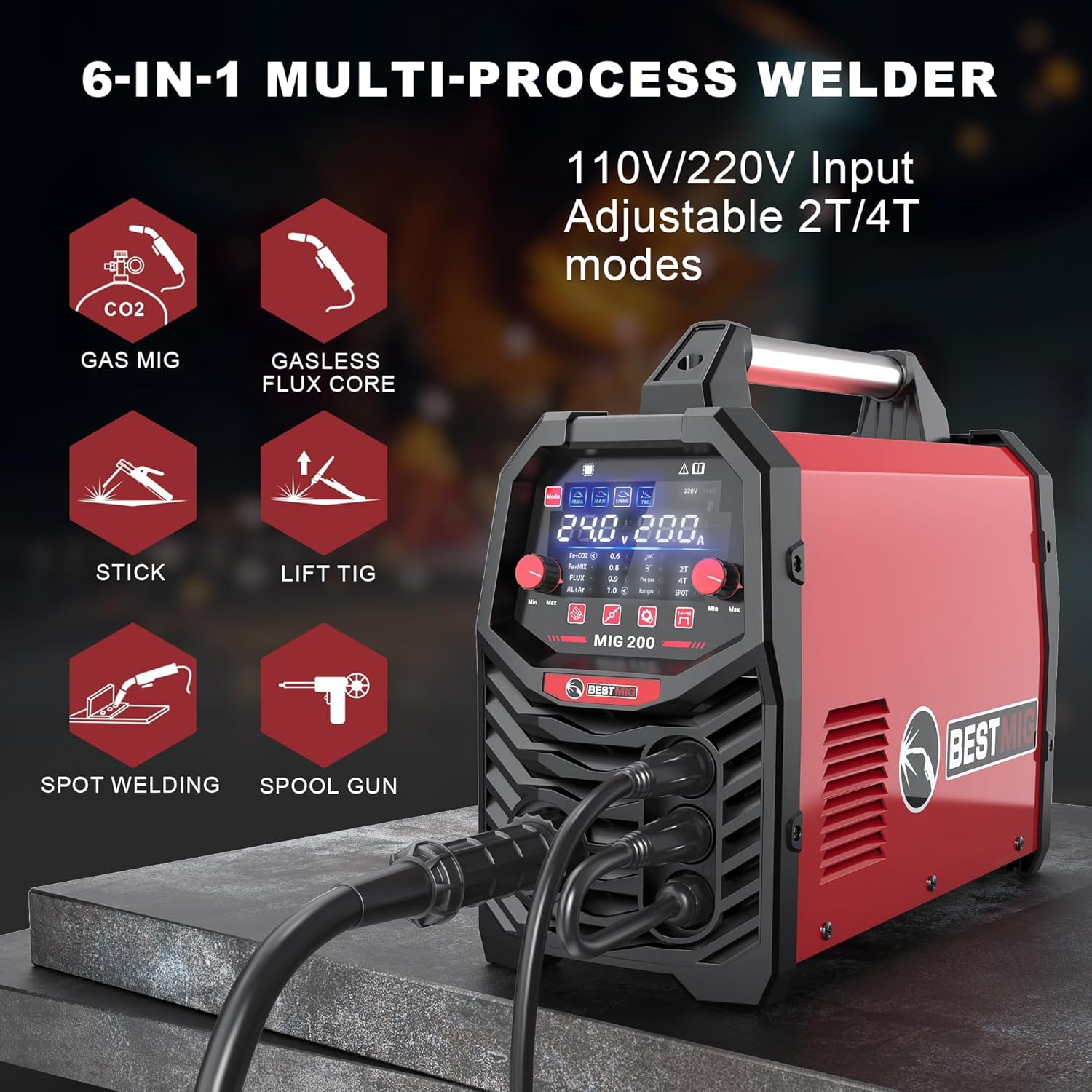 BESTMIG 200A MIG Welder - 6-in-1 IGBT Inverter Welding Machine, Gas/Gasless Flux Core, Stick, Lift TIG, Spot & Spool Gun - Portable 110V/220V Equipment