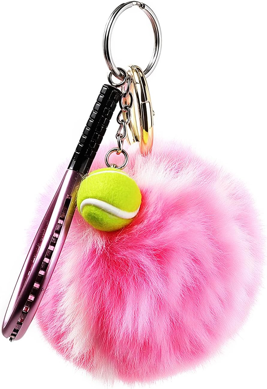 Cute Pom Pom Tennis Ball Key Chain Colorful Tennis Racket Key Rings Sports Gift for Women Men
