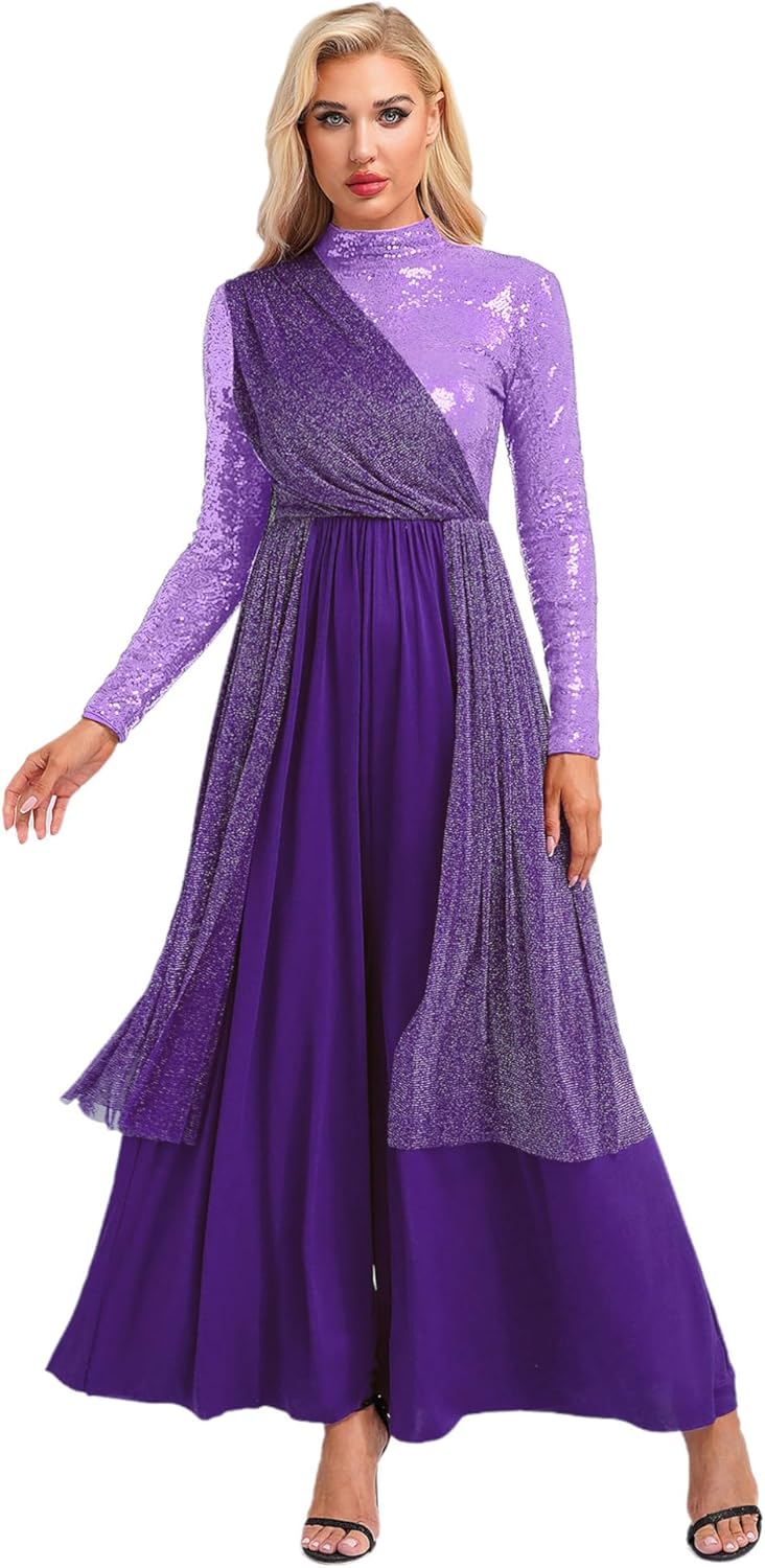 TiaoBug Womens Shimmery Asymmetric Praise Dance Dresses Overlay Dress + Wide-Leg Pants Liturgical Dancewear