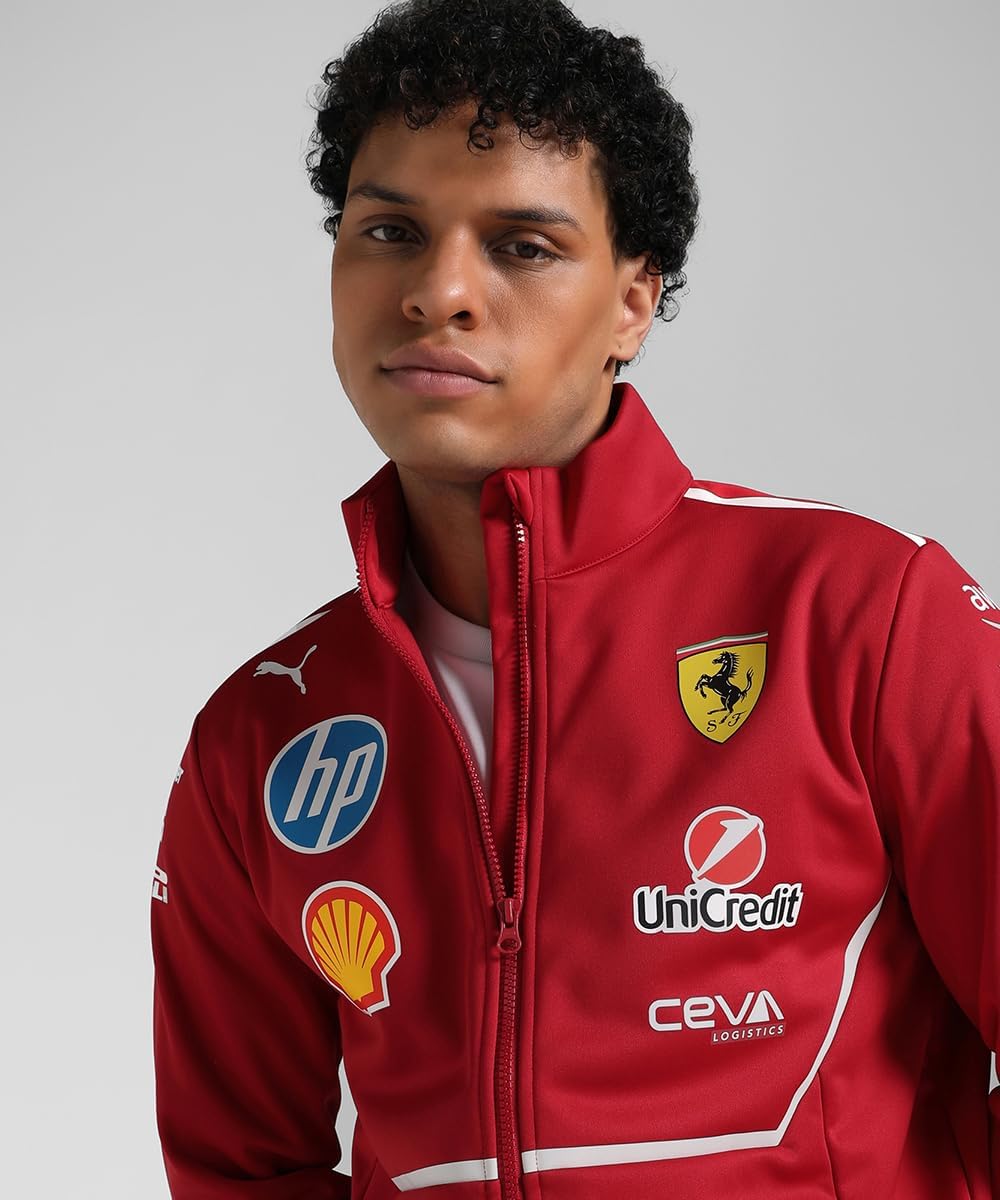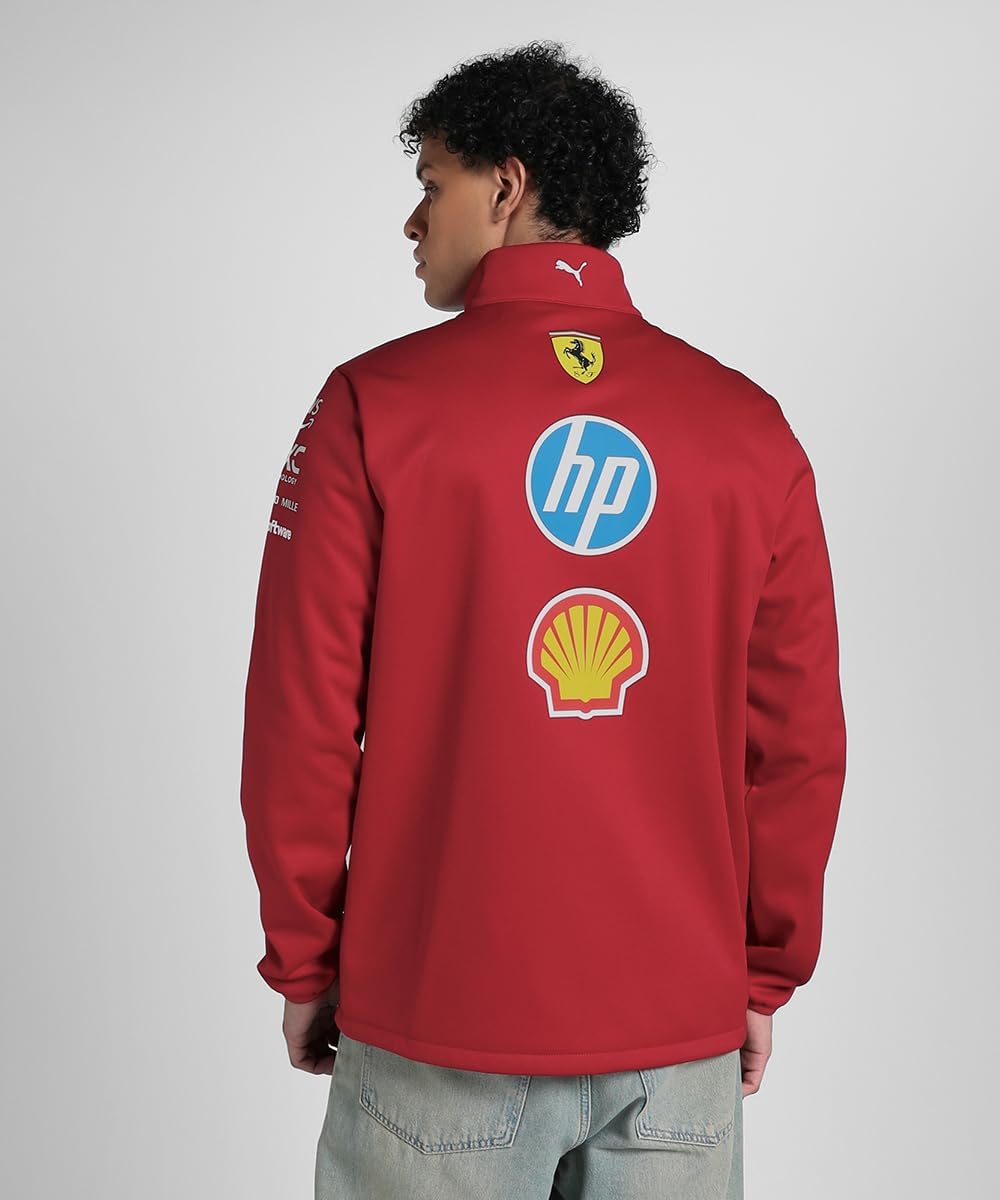 The official 2025 Scuderia Ferrari Team Softshell Jacket from PUMA, recognisable as being based on the look worn by the team throughout the 2025 Formula 1 season. The Team Softshell comes in Ferrari's 2025 Scuderia Red, with zipped side pockets and all the official Ferrari and PUMA branding.