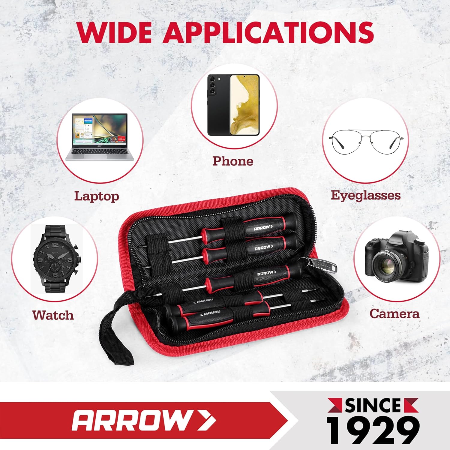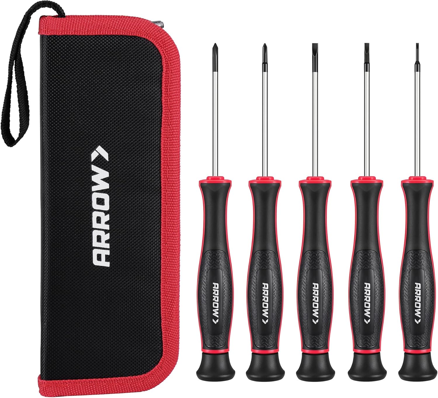 ARROW 5-Piece Precision Screwdriver Set with Pouch, Magnetic Small Screwdriver Set, Phillips, Slotted, Cr-V Steel, Mini Screw Drivers for Eyeglass, Watch, Computer, Laptop, Phone Repair