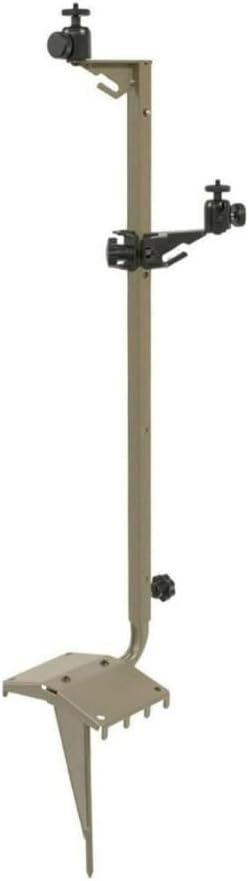 The mount features a ¼” tripod mount for cameras and solar power packs, providing a versatile and secure setup. It includes a second modular mount, allowing you to mount two cameras or a camera and solar pack together. The mount offers 360-degree multi-pivot positioning with 180-degree tilt capabilities, ensuring flexible camera placement. Constructed from all-steel material with a weather-resistant powder coat, it is designed for durability and protection against the elements. A steel kick plate with a 6.5” built-in ground stake provides stability, while additional holes allow for extra ground stakes. The mount is adjustable with an expandable height range of 29” to 49” and includes built-in hooks for organized cable management, keeping everything tidy and secure.