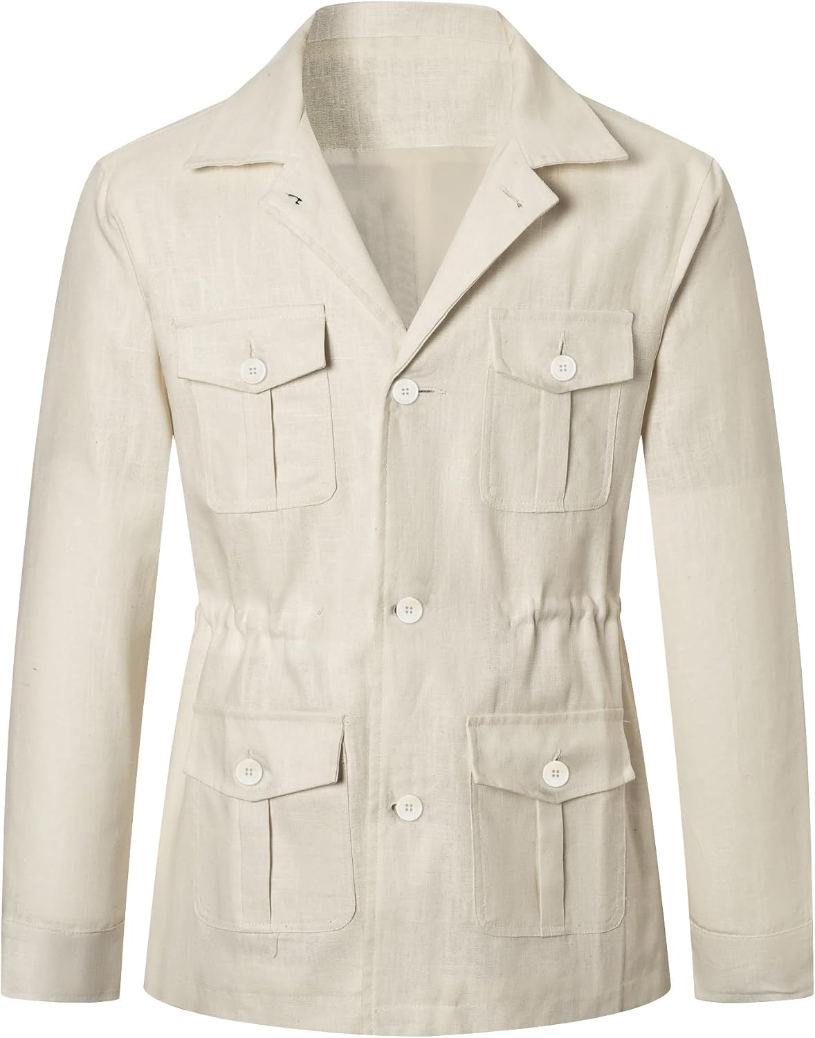 Betusline Men's Safari Linen Jacket,Military Cargo Jacket with Pockets