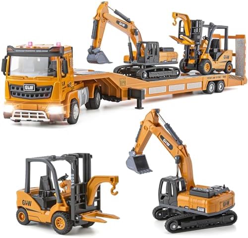 Fully-Functional Die Cast Construction Vehicles Set:The construction truck set of 3. Includes 1:40 scale semi truck toy, excavator toy, forklift toy. gifts perfect toys for 3 4 5+ year old boy.