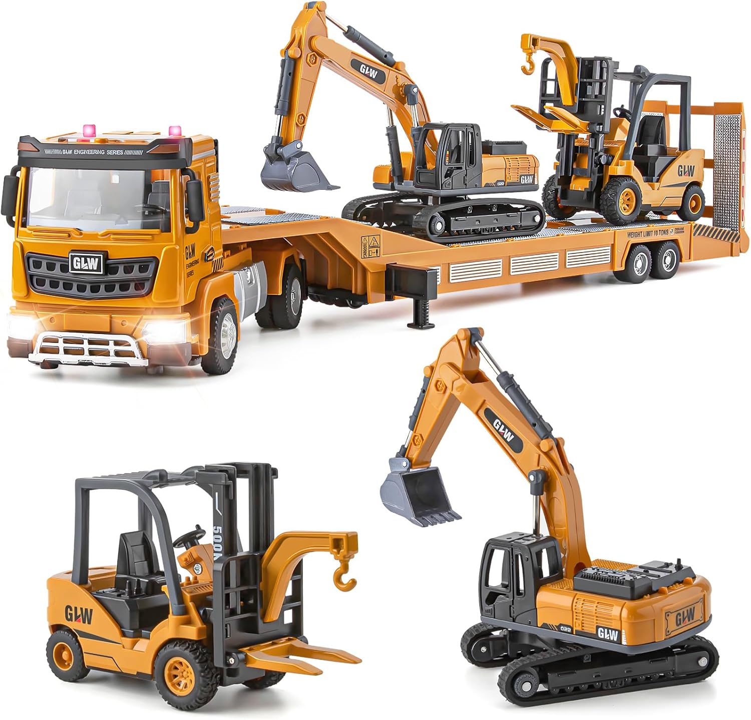 Die-cast Construction Truck Toys Set w/Semi Truck, Excavator, Forklift, Alloy Engineering Construction Vehicles Toys w/Lights & Sounds, Model Excavator,Model Forklift Toys for Boys Kids