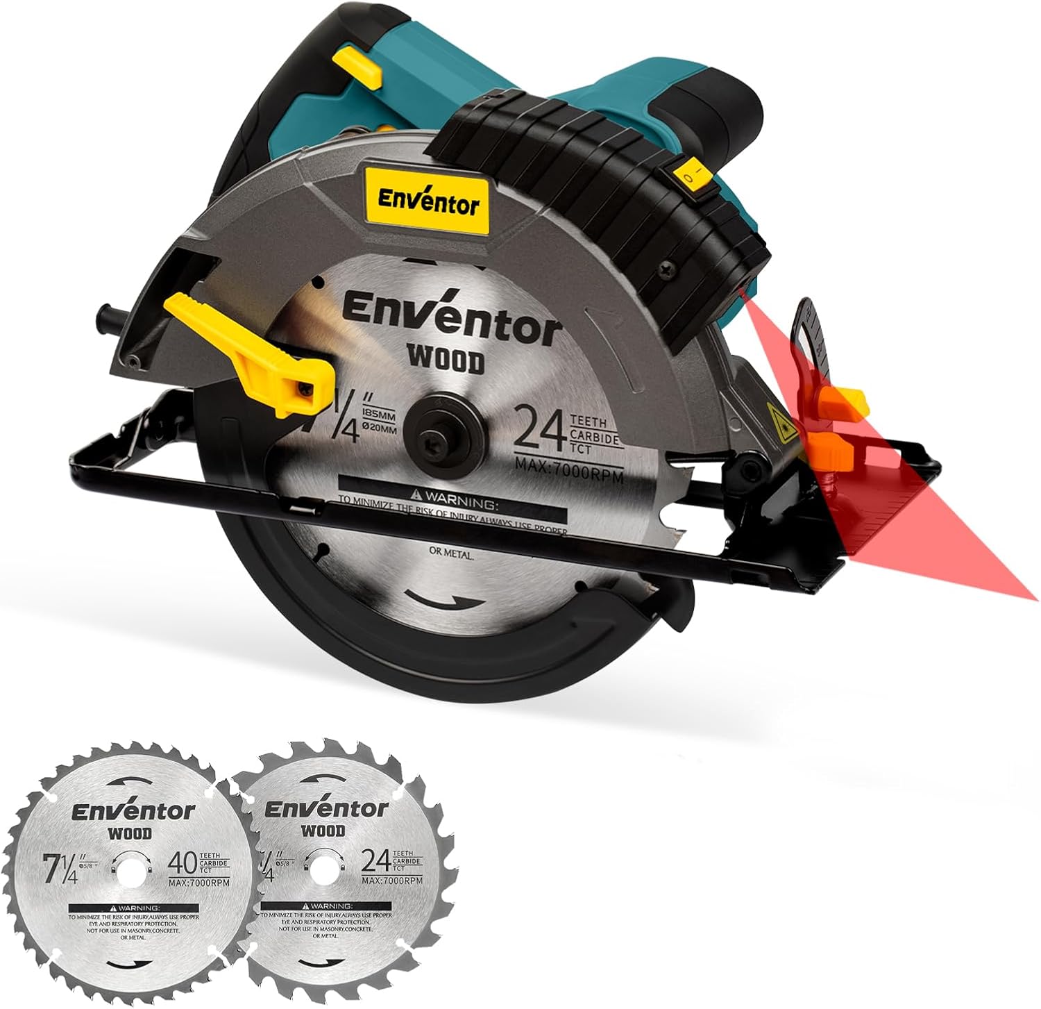 Enventor Circular Saw Corded, 14A Electric Circular Saws 7-1/4-Inch with Laser Guide, 2 Blade Saws (40T/24T), Max Cutting Depth 2-7/16"(90°), 1-13/16"(0°-45°), Single Handed Bevel, 5500RPM, Blue