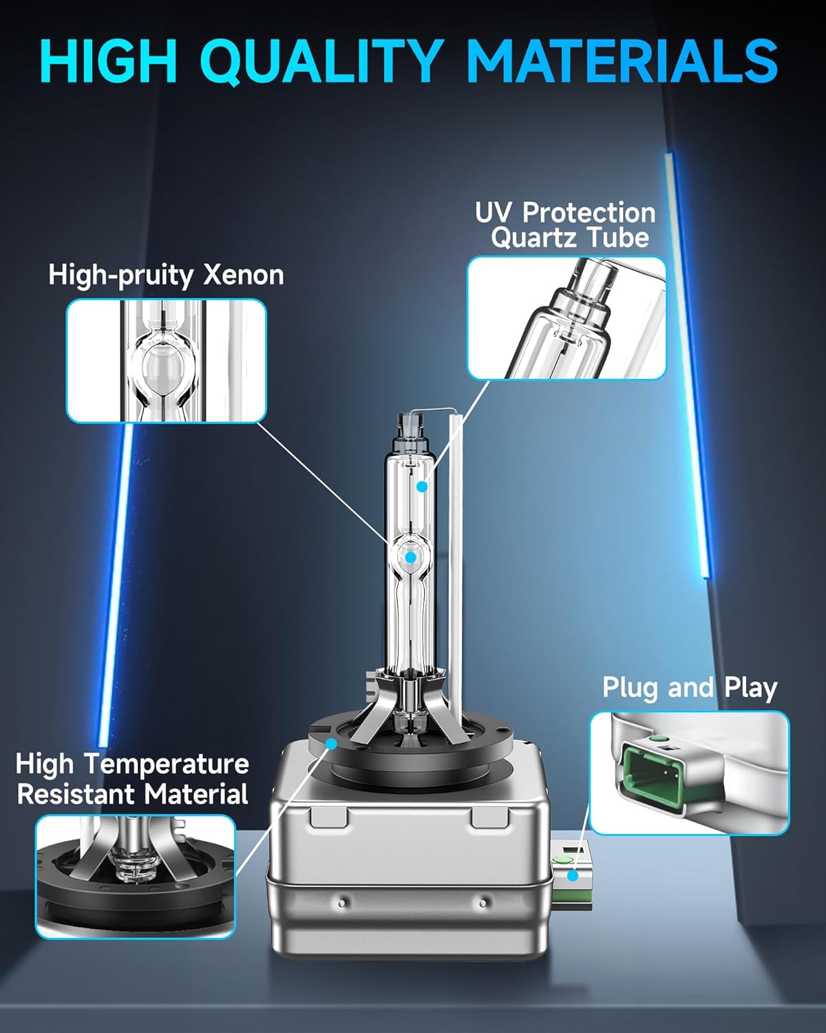 【Service Life of 3500 Hours】SENROBO xenon headlight bulbs are made of 100% quartz UV resistant glass, high-purity xenon gas, high-temperature resistant material, stainless steel metal bracket, and ceramic insulation tube. It is sturdy and durable, with a lifespan of up to 3500 hours, reducing the frequency of replacing xenon bulbs. It is IP68 waterproof and can operate stably in extreme weather conditions such as rainy, foggy, and dust storms