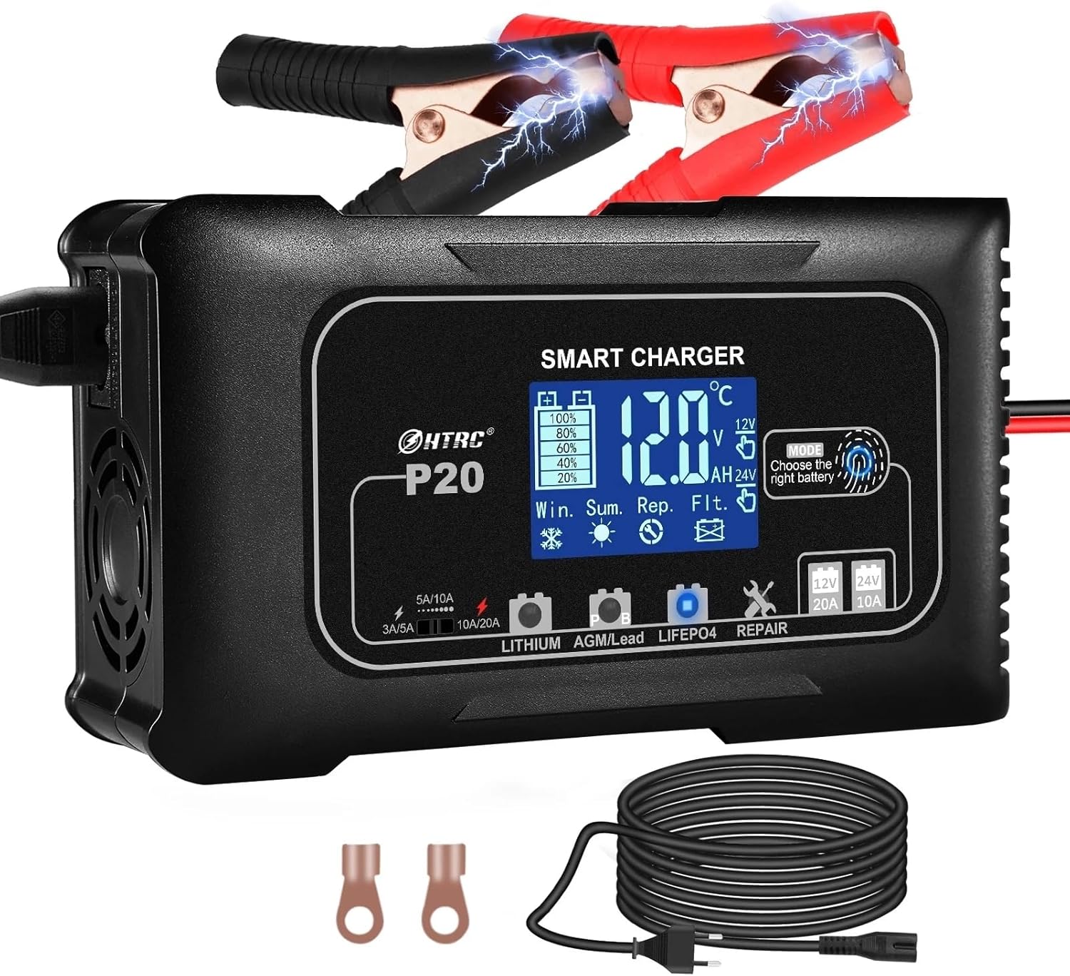 HTRC 20A Car Battery Charger 12V20A 24V10A 7-Stage Pulse Repair Maintainer Car Charger for Lithium Lead-Acid LIFEFO4 AGM BatteryFeatures:1. Lithium, Lead-acid, LiFePO4 battery type can be selectable.2. Fully automatic microprocessor control. 7-stage charging process provides the best possible and efficient battery charging.3. Charging voltage adapts to temperature to prevent over- or under-charging of battery .4. Can repair old and idle batteries.5. With reverse polarity protection, short circuit protection, over-charge protection, sparks free contact .6. With LCD screen showing voltage, current, battery power, temperature etc .Q&AQ1. What is the maximum charging current? whether can reach or not?A1:To protect the battery, the system automatically identifies the battery voltage and selects the most appropriate current to charge the battery. When the battery voltage is low (for example, the 12V battery is less than 11V), the system automatically charges the battery at the maximum current.Q2:Does The LifePO4 battery can fully charged?A2:There will be a callback feature after this type of battery is full, and the power is off about 1V, which is normal, please know!Features:- Charge current switch.-For batteries used on Battery Management Systems(BMS) only.-For charging 12V or 24V LiFePO4 batteries.-For activation or maintenance of weak, old and idle batteries.Used to select a mode for charging 12V or 24V Lithium batteries,-Can not repair severely damaged batteries. Not for Lithium and LiFePO4 batteries.-For ordinary lead-acid batteries/maintenance-free batteriesincluding AGM, GEL, SLA, WET, DEEP CYCLE, EFB,Calcium, etc.Specifications:AC input: 100-240 V 50/60HzOutput voltage :12 V / 24 VOutput current :12V20A & 24V10ANo-load output voltage :27.6VMinimum starting voltage: >7.0VPowe