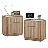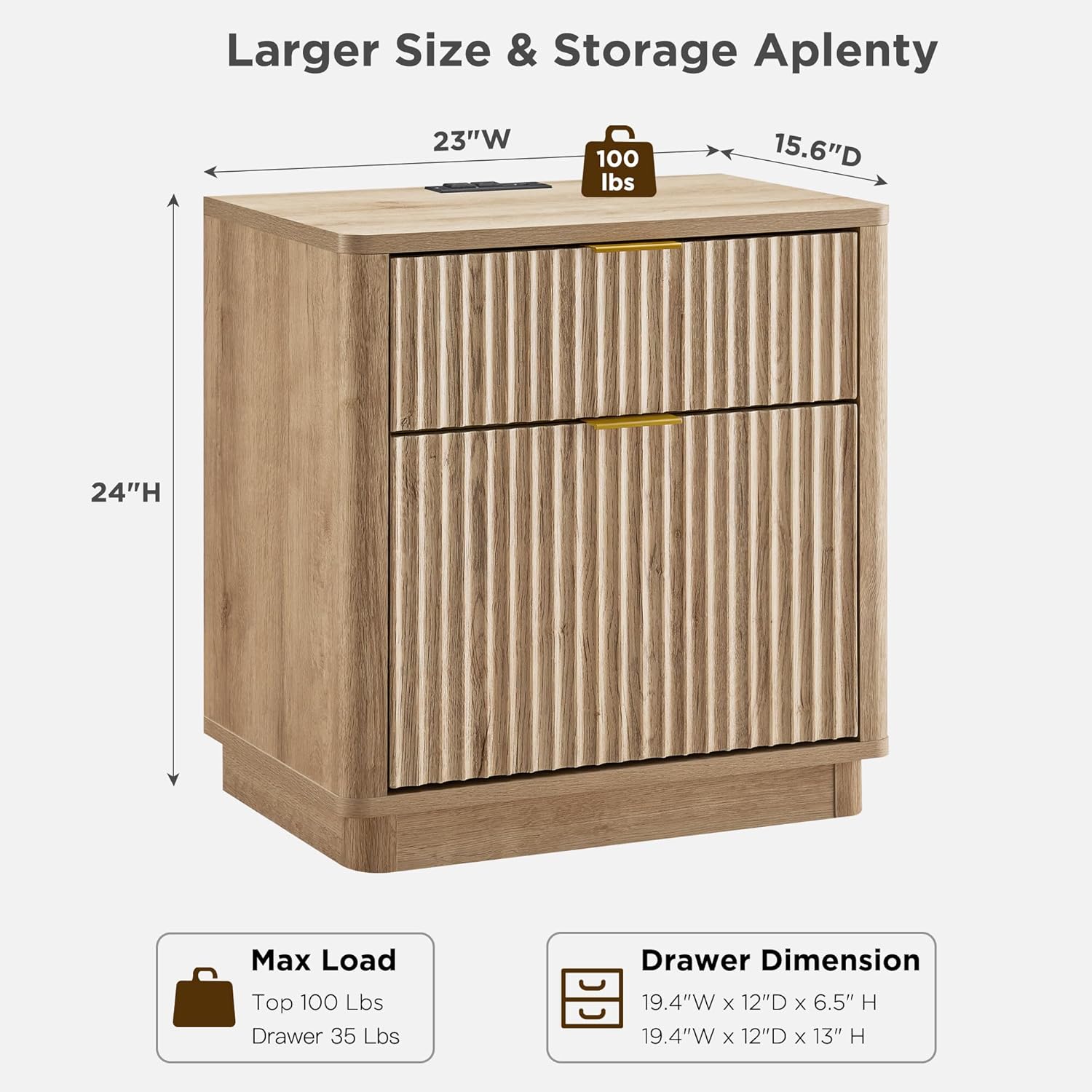 T4TREAM 23'' Fluted Nightstand Set of 2 with Charging Station, Large 2 Drawer Bedside Table, Modern End Table with Storage, Mid Century Night Stand for Bedroom Living Room, Curved Profile, Natural Oak