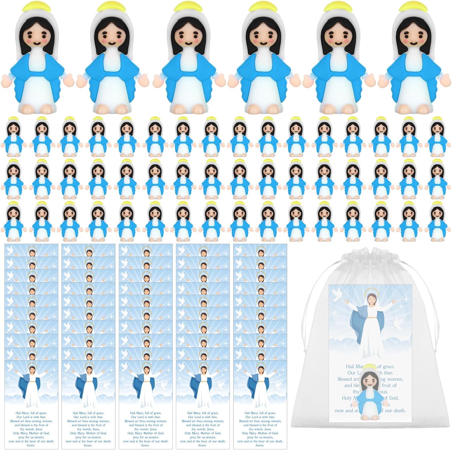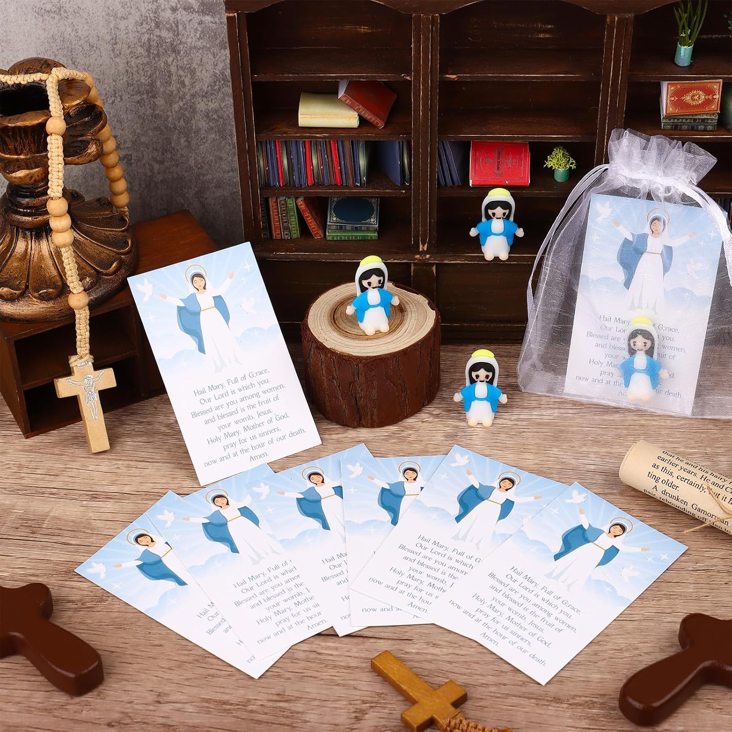 50 Set Little Virgin Mary Figurines Religious Tiny Virgin Mary Figurine Prayer Cards Organza Bags Rubber Mother Mary Doll Church Gift for Sunday School Baptism Activities Easter Party (Blue)
