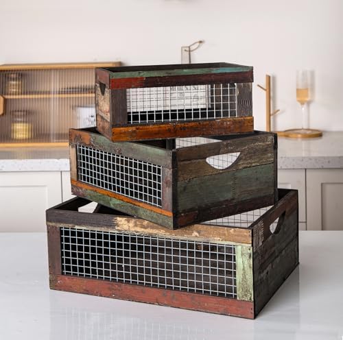 TIMRIS Set of 3 Rustic Wood Nesting Crates, Farmhouse Distressed Wooden Storage Boxes, Decorative Reclaimed Wood Organizer Baskets with Wire Mesh (Random)