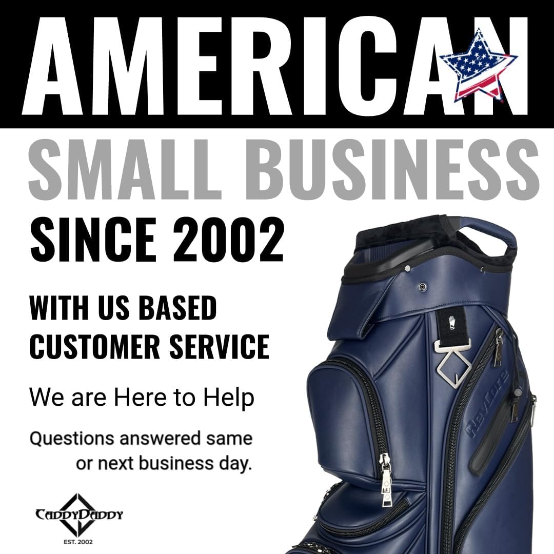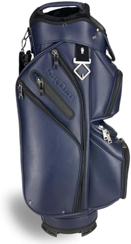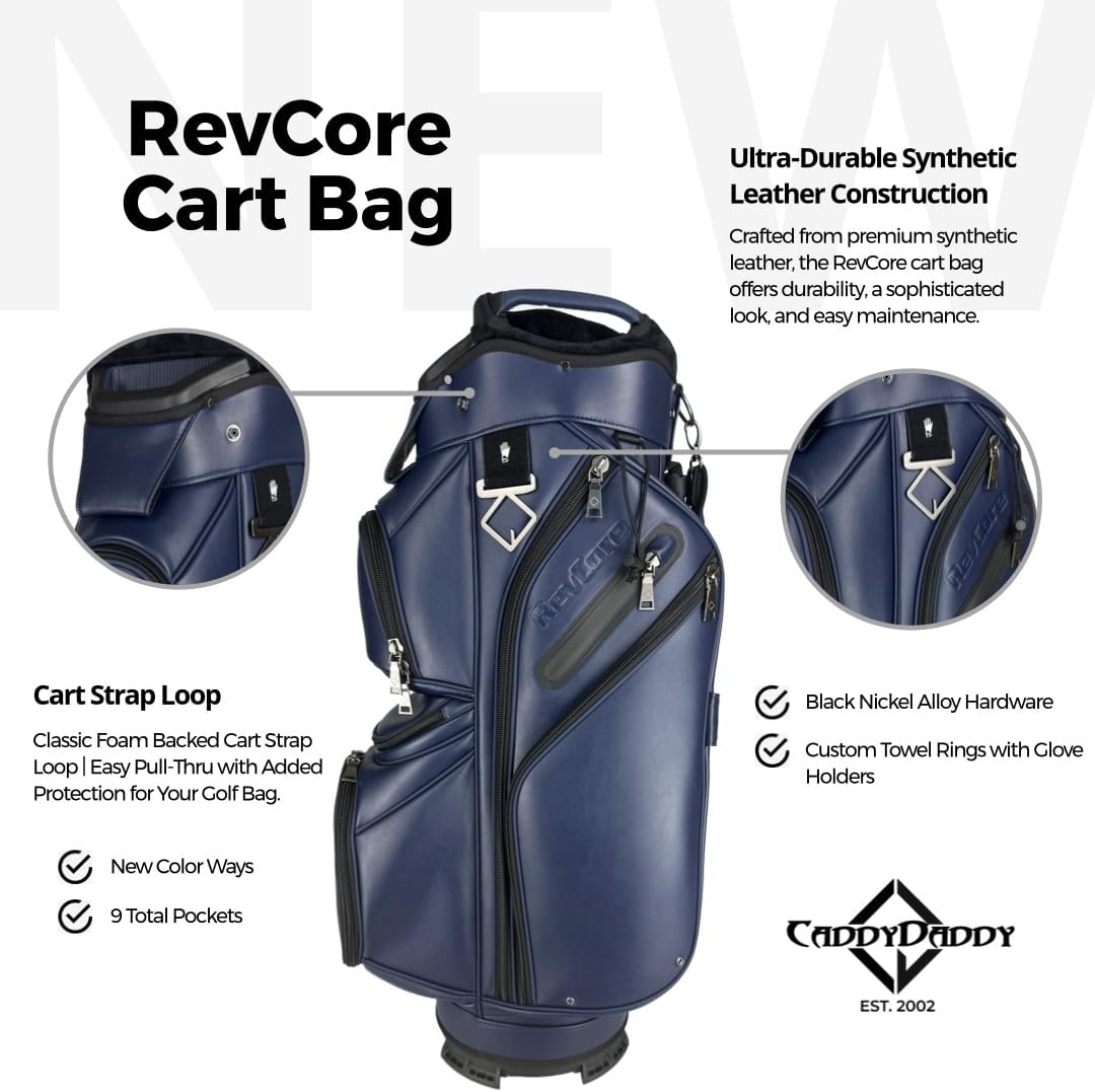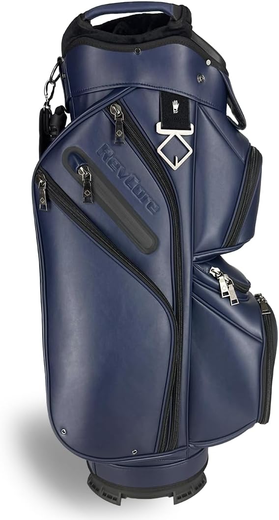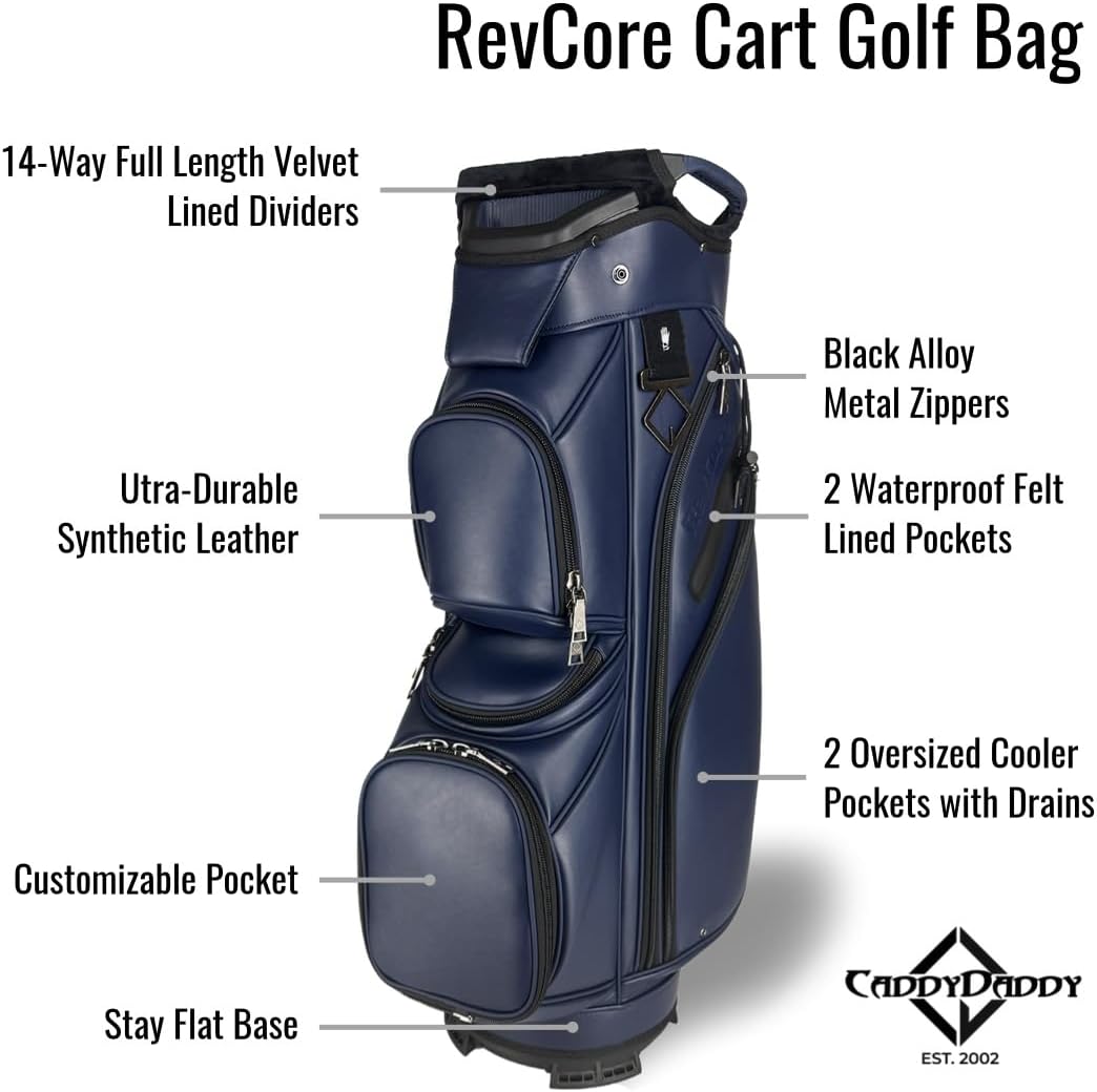 REVCORE Luxury Golf Cart Bag, Premium Synthetic Leather, 14 Way Dividers, Black Alloy Hardware, 9 Pockets w/2 Insulated Cooler Pockets, 2 Felt-Lined Valuable & Oversized Putter Well & Rain Hood