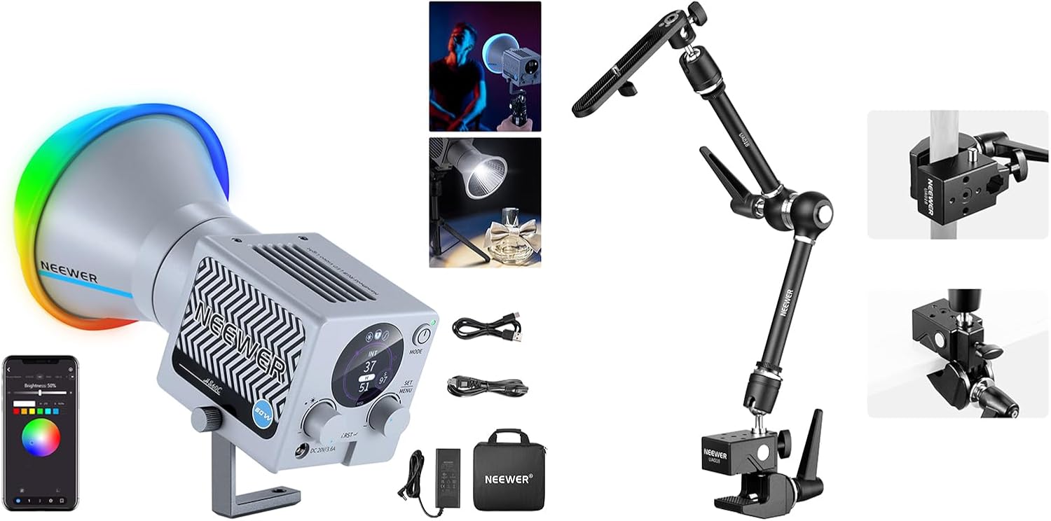 NEEWER HS60C 60W Portable RGB LED Video Light Handheld Fill Light, 8700Lux/1m 2700-6500K CRI97+ Dimmable COB Continuous Output Lighting for Video Recording Streaming, UA018 21" Magic Arm Kit Included