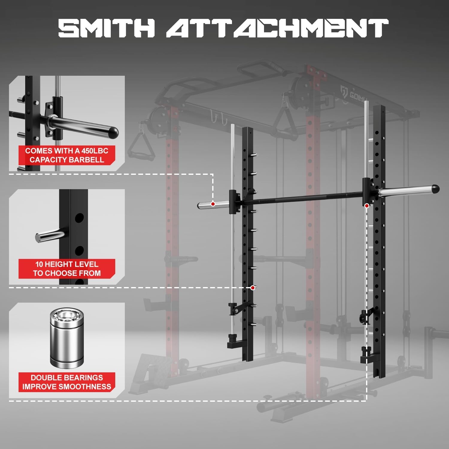【2000LBS Heavy-Duty Steel Construction】: The GOIMU S1 Smith Power Cage supports up to 2000LBS of weight, ensuring superior stability and safety for intense workouts. Every component, including the attachments, is designed for durability and strength. Overall dimensions are 59.84"L x 46.85"W x 84.25"H with multiple 1'' holes, it provides ample exercise space. Experience the same level of quality and performance you'd expect from a commercial gym, right in the comfort of your own home.