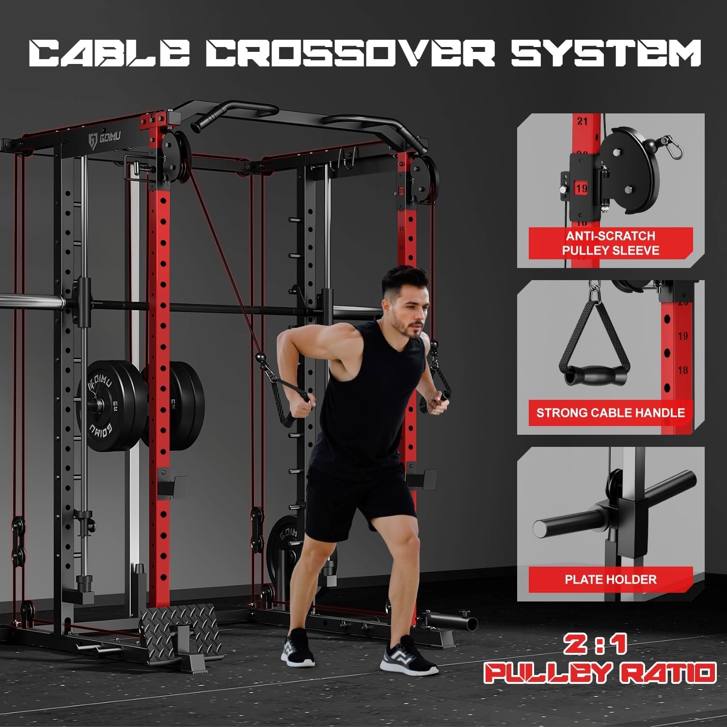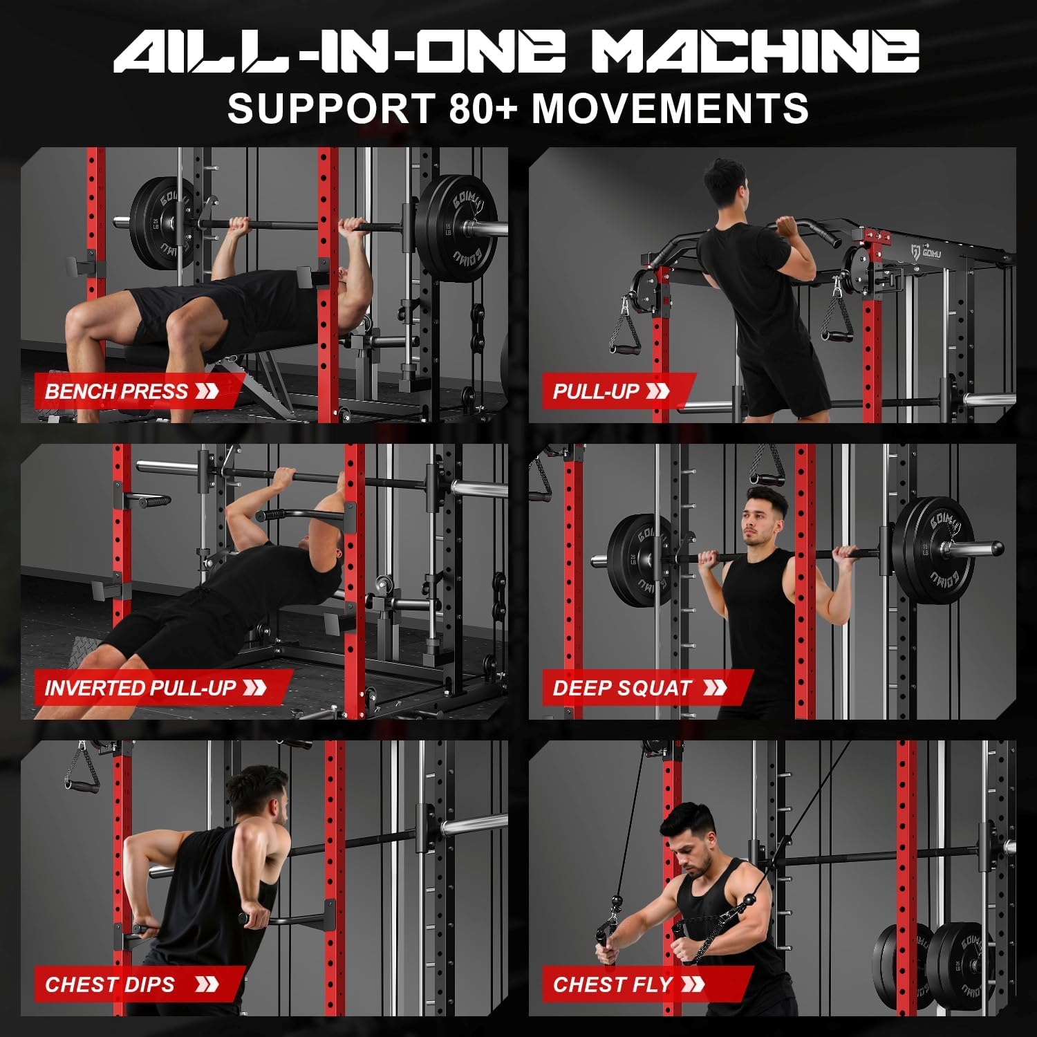 【Home Gym Station】: The GOIMU S1 integrates a Smith machine, power cage, and fuctional trainer system into one versatile unit, featuring 10 height-adjustable pillars and additional accessories. This all-in-one Smith Machine supports a wide range of exercises, including squats, bench presses, deadlifts, lat pulldowns, cable crossovers, and more. It’s the ultimate solution for full-body strength training, eliminating the need for multiple machines.