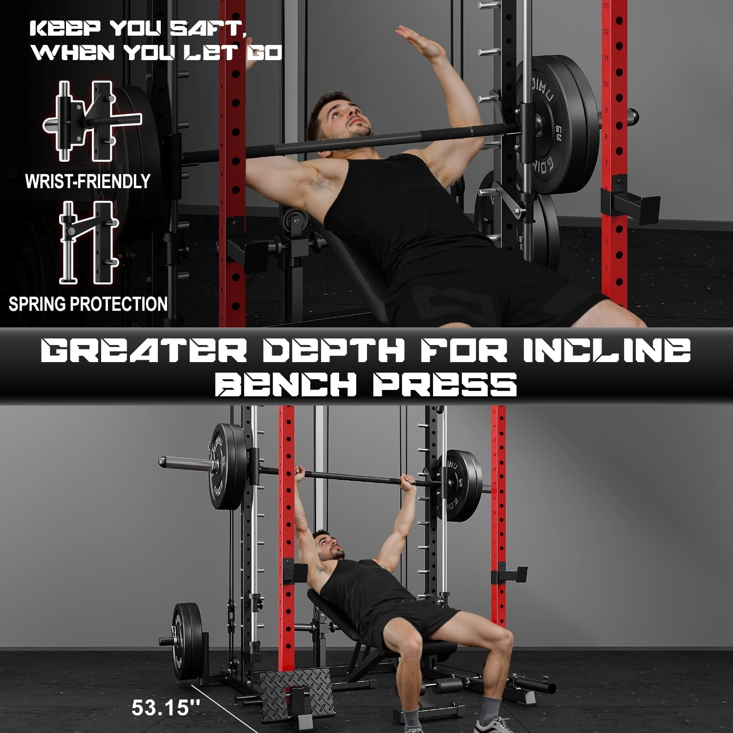 【Great Bang For Buck】: Transform your space into a full-body workout station with over 25+ accessories, including a tricep rope, T-bar, pull-down bar, counterweight racks with clamps, and a 360-degree landmine attachment. A bonus accessory to enhance your training program. Despite its robust build, this power cage only occupies 17.88 square feet of floor space, making it perfect for apartments, garages, or small home gyms.