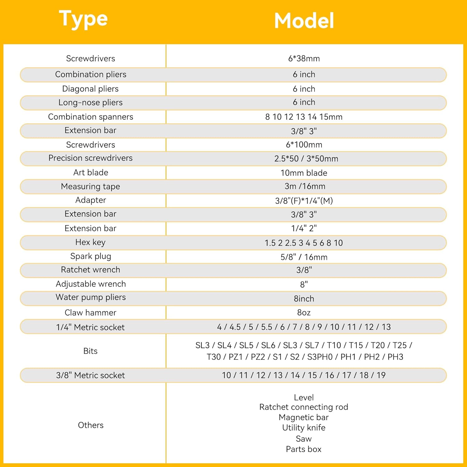 Complete All-Purpose 199-Piece Tool Kit for Home Repairs Includes professional-grade tools: ratchet wrench, screwdrivers, hex keys, pliers, wrenches, claw hammer, hacksaw, level, full 1/4" & 3/8" metric sockets, and bits. Ideal for mechanical repairs, household maintenance, and multi-scenario applications