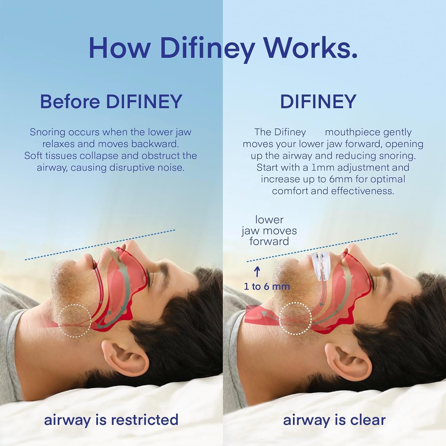 Innovative Snoring Solution: Difiney Anti snoring Device is designed to reduce snoring by gently repositioning your jaw to improve airflow, ensuring a restful night's sleep. With a design patent application filed, Difiney is in patent-pending status, offering innovative snore relief backed by cutting-edge design.