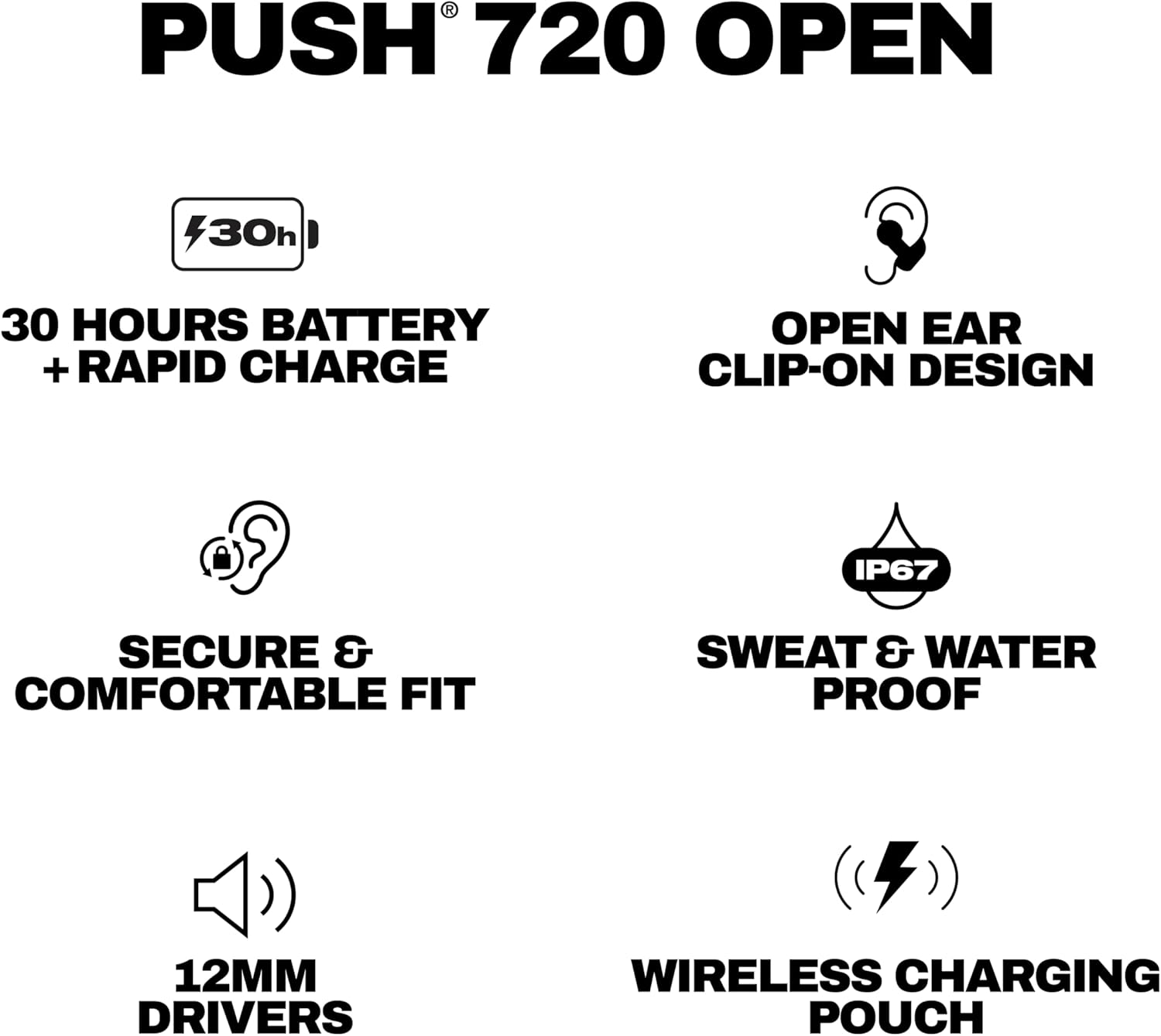 OPEN EAR FORM FACTOR Push 720 Open keeps your ears open and your sound dialed in. Its ear cuff design lets you hear the world without missing a beat, while 12mm drivers pump out full, focused audio. All awareness, no compromise
