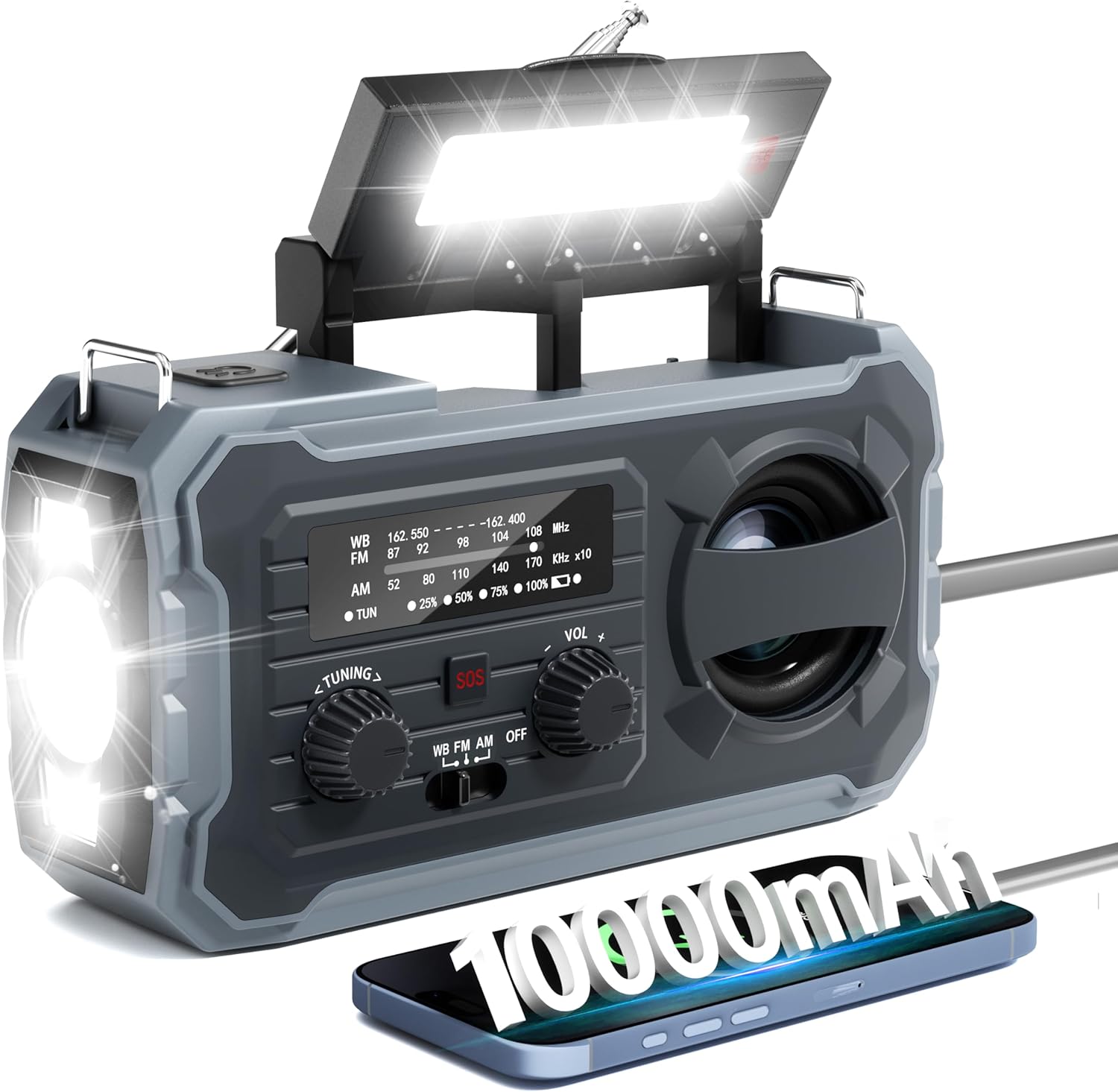 Hand Crank Emergency Radio, 10000mAh Weather Radio with AM/FM/NOAA, Solar Prower, SOS Alarm, Phone Charging, LED Flashlight, Portable Survival Gear for Outdoor & Home Emergencies Kits, Grey