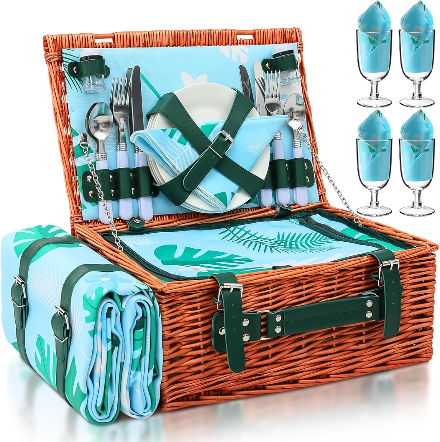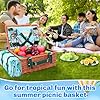 Leinuosen Tropical Wicker Picnic Basket Kit for 4 Persons with Waterproof Green Palm Picnic Blanket Willow Hamper Insulated Cooler Bag Utensils Cutlery for Camping Outdoor Summer Hawaii Luau Party