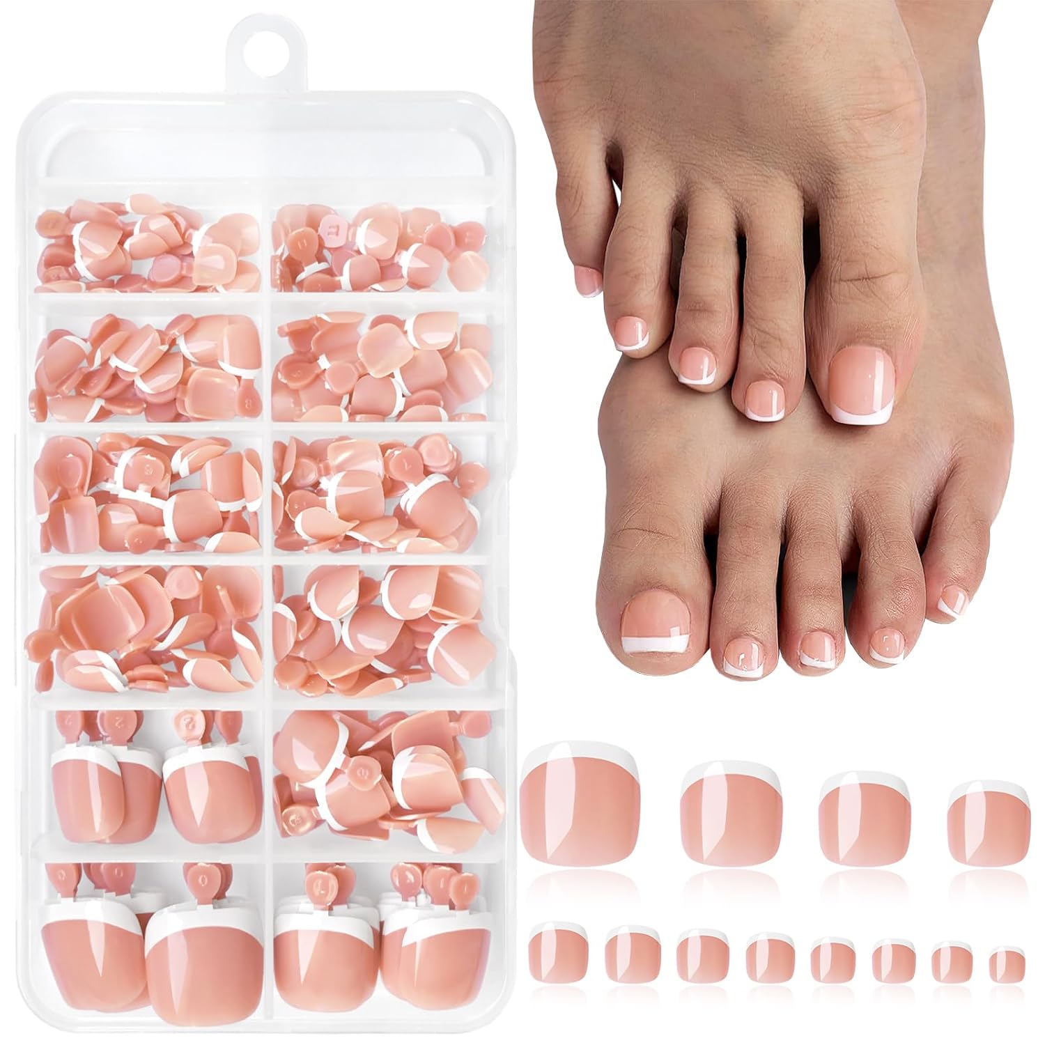 Cute toes nails press ons for women: Total 216pcs white french tip press on toenails including 12 grids of different sizes presson toenails for women. The fake toe nails glue on is very useful and nice touch with glossy finish design. Whether you're attending a special event, lounging at home, or going about your daily activities, our pink toe press ons offer versatile wear that adapts to any occasion, giving you the confidence to show off your stylish acrylic toenails.