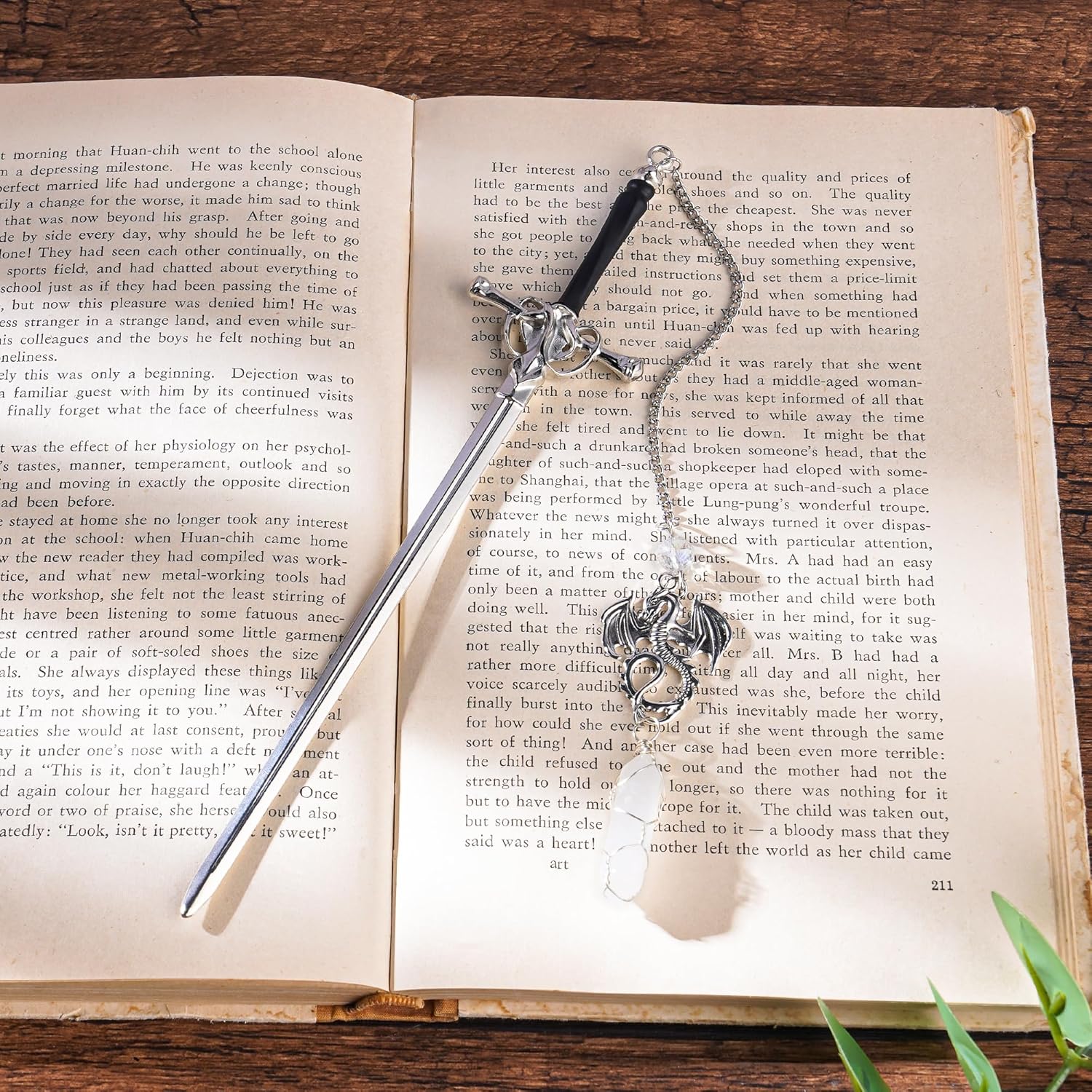 High Quality Metal: The dragon sword bookmark is made from high-quality metal, ensuring both strength andreliability. The crystal pillar is wrapped with fine wire by hand, showcasing artisanal craftsmanship. This detail not only makes the bookmark functional but also a piece of art in itself. The unique combination of metals and the genuine crystal stone offers both an aesthetic and meaningful experience, the charm dragon sword bookmark