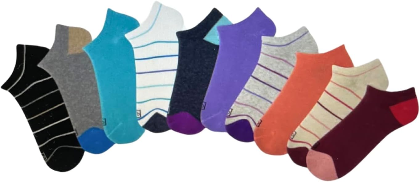 K. Bell No Show Socks, 10 Pairs, Assorted Solids and Stripes, Fits Shoe Sizes 5.5-10