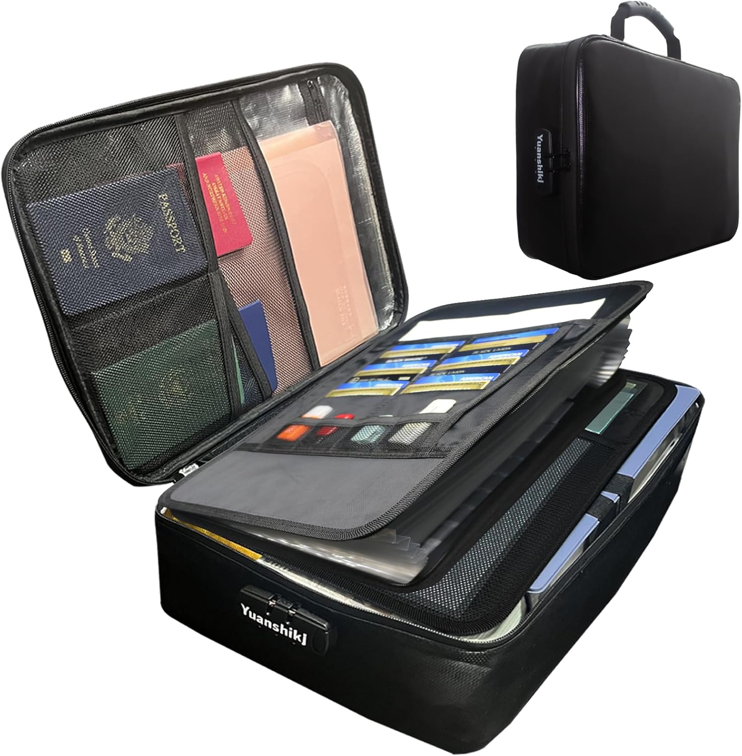 Yuanshikj Heat Insulated Fireproof Waterproof Safe File Organizer,Document Organizer Box with Lock Labels,Multi-Layer Portable Home Travel Safe Storage Box for Important Documents (Black)