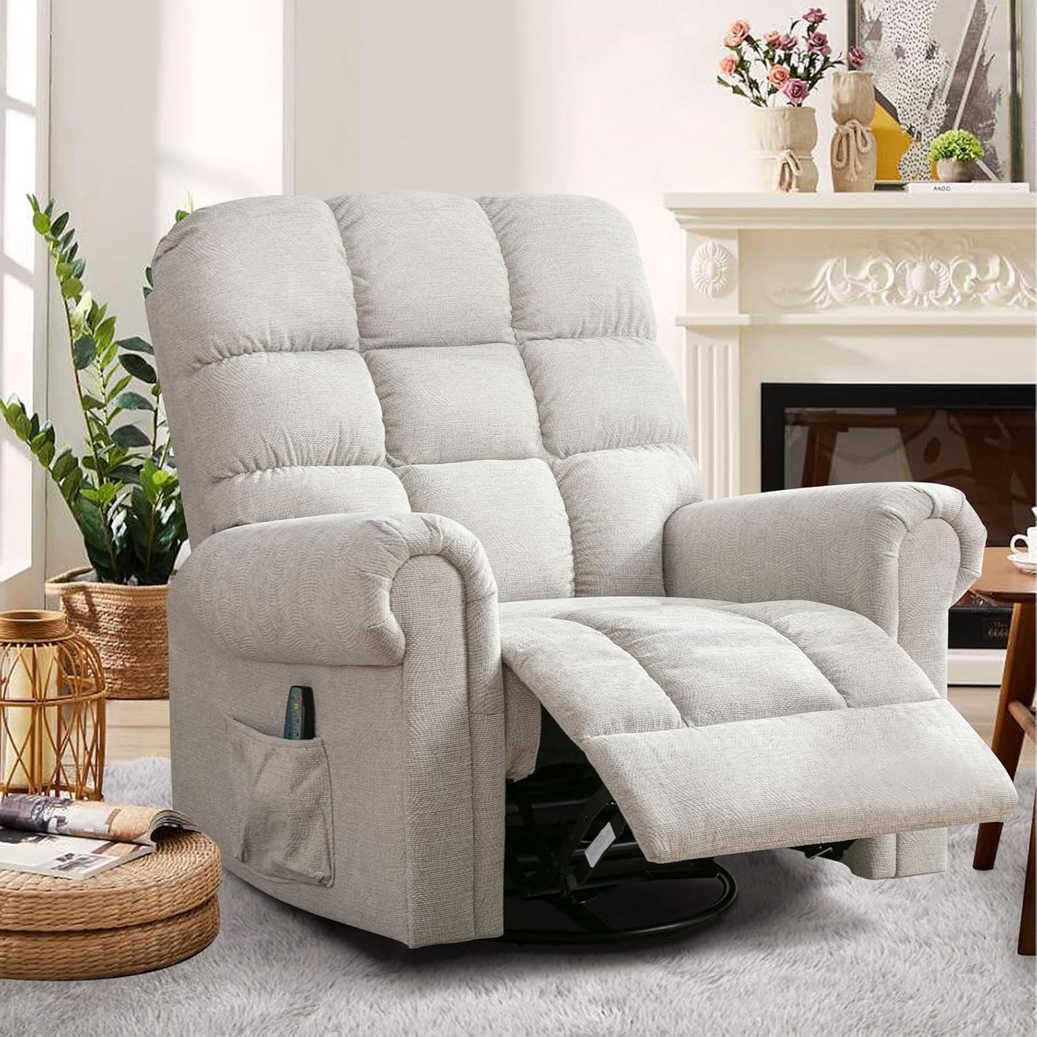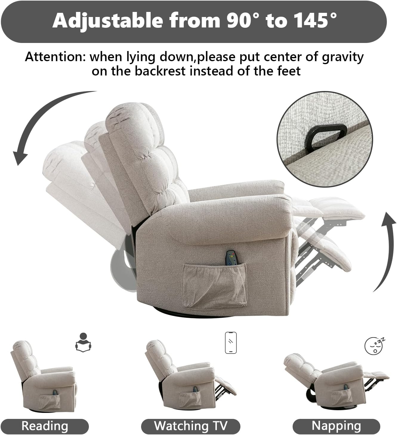 Oversized Massage Recliner Chairs with Massage and Heat, 360° Swivel Rocker Recliner, Breathable Fabric Overstuffed Reclining Sofa for Living Room Bedroom (1, Cream White)